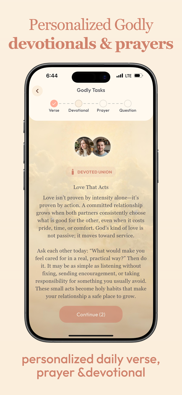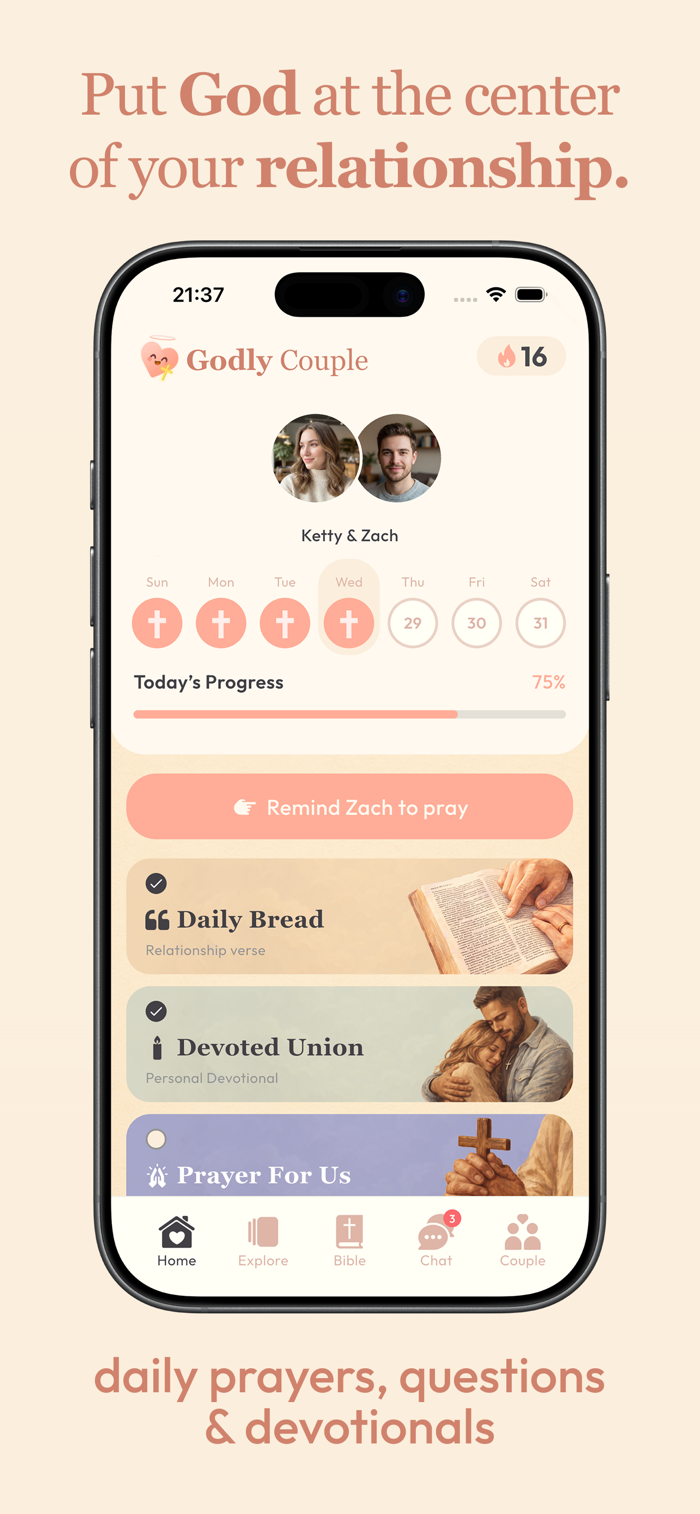 Strengthen your bond and grow closer to God together. Godly is the Christian couples app designed to help you and your partner put faith at the center of your daily lives. Through shared devotionals, daily Bible reading, conversation starters, and a collaborative prayer life, Godly helps you build a lasting, faith-filled foundation — whether you are dating, engaged, or married.