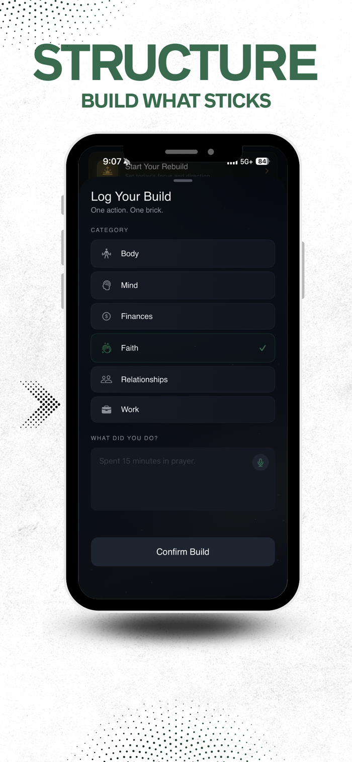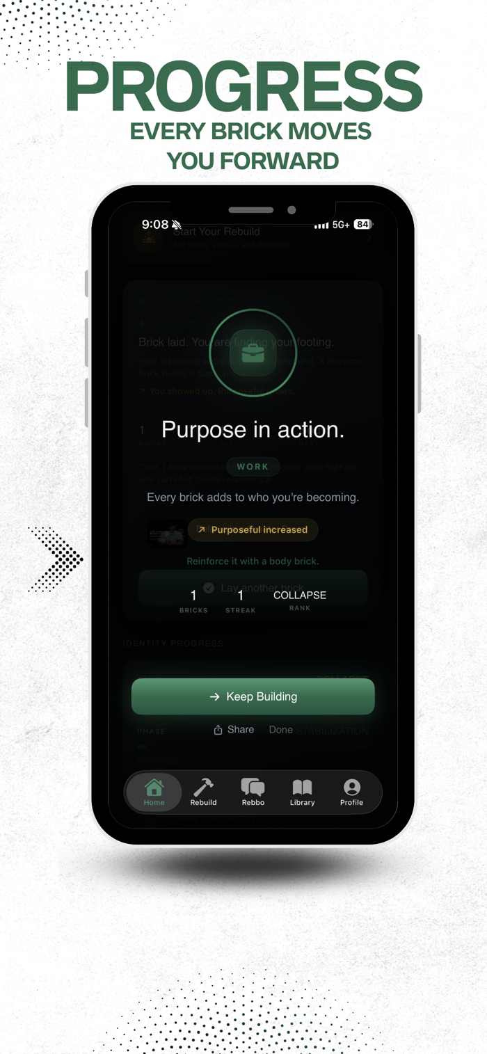 • Track daily discipline through “Bricks Laid”