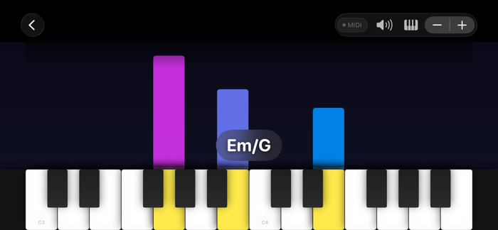 - 瀑布流视觉:自由弹奏模式下,多色瀑布流音符随指尖倾泻,实时更新和弦名称,视觉与听觉双重享受。