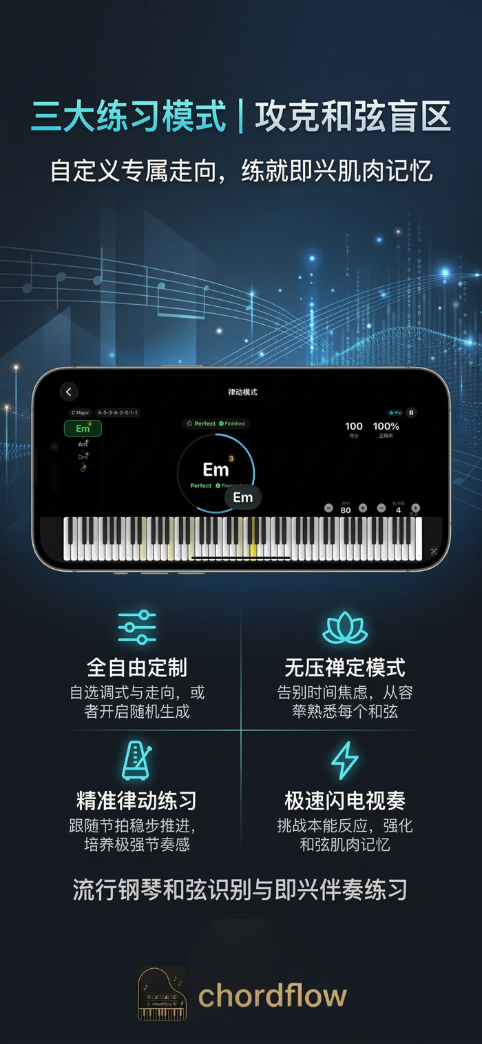 - 律动模式:节拍器驱动的时间判定,精确到毫秒级的首音时机打分,专治节奏不稳,强化和弦走向的实战演奏。