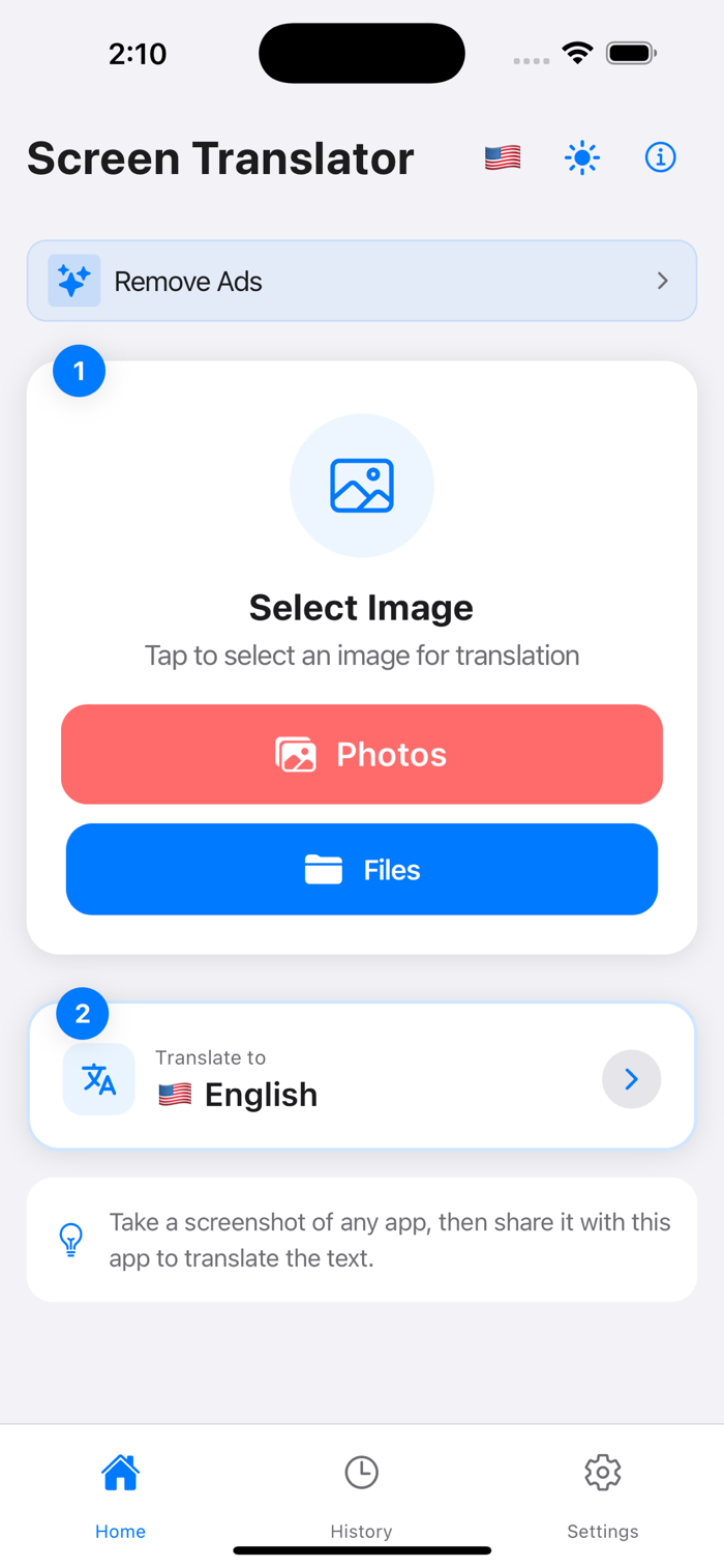 使用设备端机器学习,即时翻译任何截图中的文字。无需网络连接 - 您的图片永远不会离开您的设备!