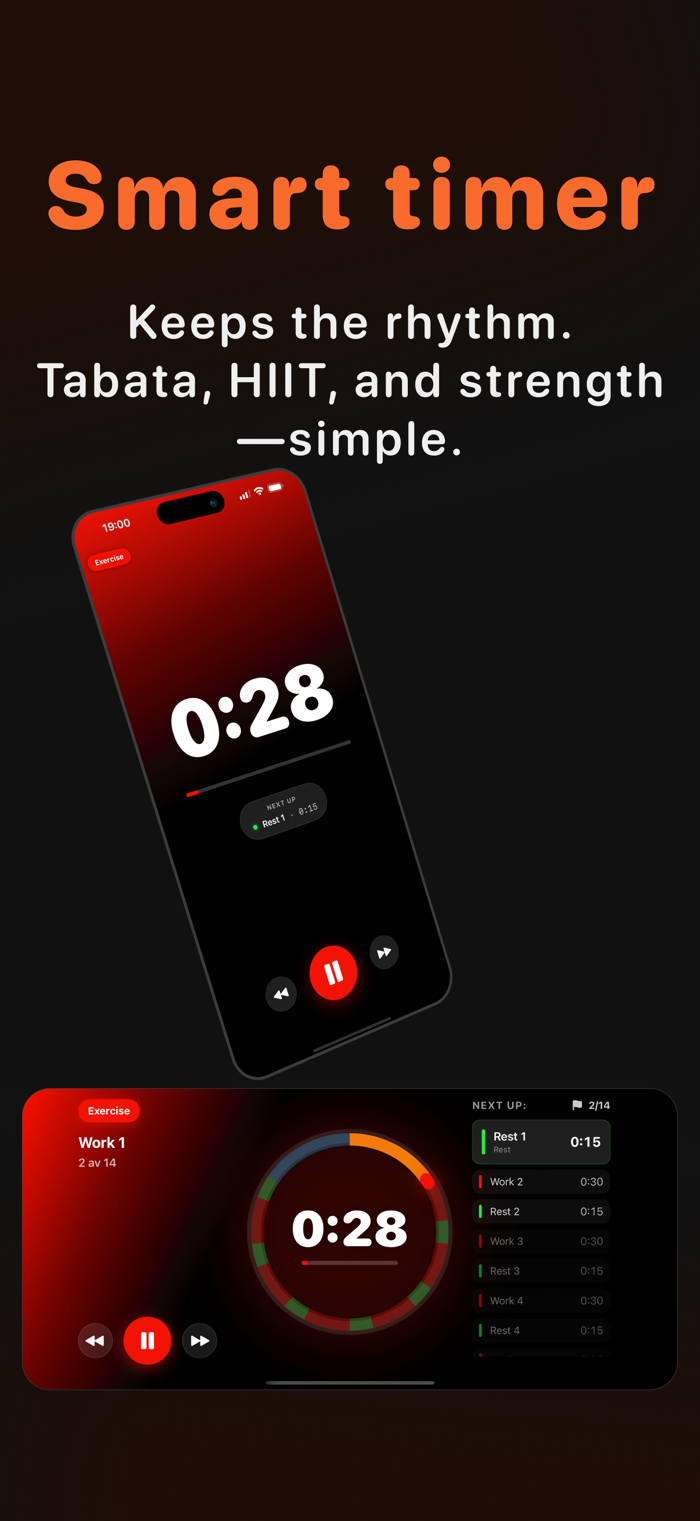 Run Tabata, HIIT or strength intervals with the smart timer. Customize work and rest periods, number of rounds and audio cues. The timer works in both portrait and landscape mode — perfect to set up next to you at the gym.