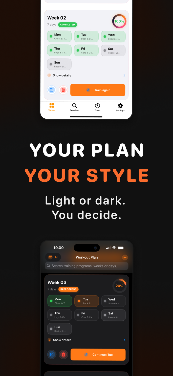Create custom workout schedules with any number of weeks and days. Assign muscle groups, set your reps and sets, and get a clear overview with progress circles showing how far you've come. From push/pull/legs to full-body programs — you decide the setup.