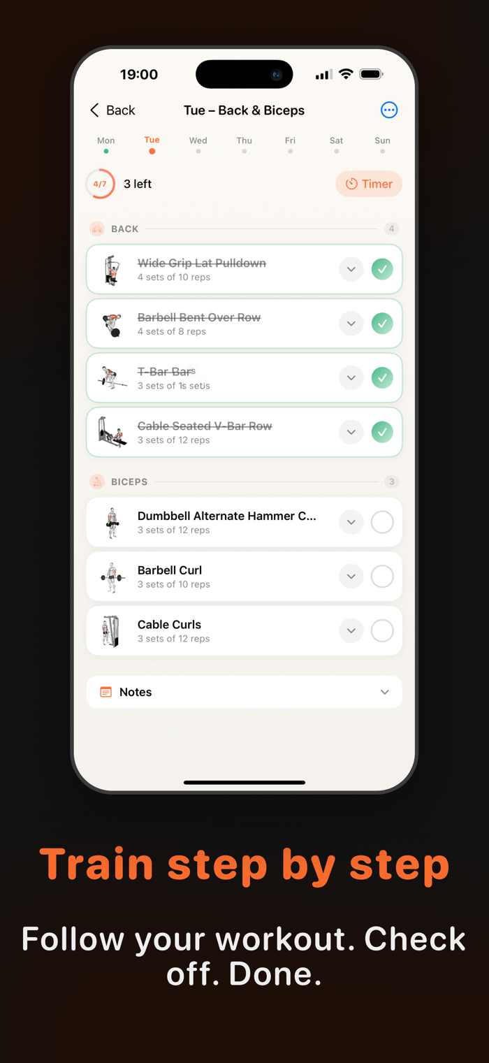 Follow today's session directly in the app. Check off exercises in real time and watch your progress indicator fill up. Each exercise shows sets, reps and rest periods so you always know what's coming next.