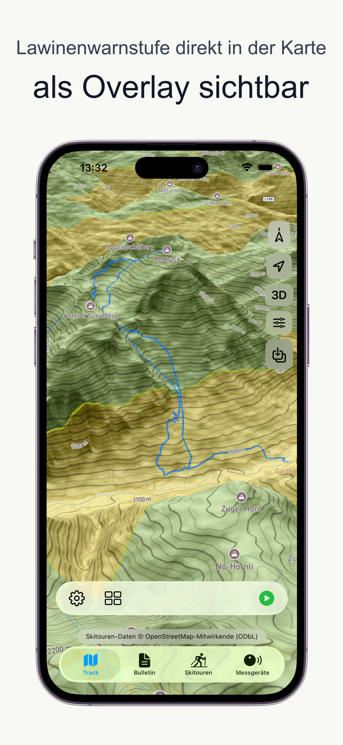 - Die Skitourenkarte legt Hangneigung, Exposition, Schutzgebiete und weltweite Skitourenlinien aus OpenStreetMap (ODbL) übereinander, damit kritische Passagen sofort sichtbar werden – auf iPhone und Apple Watch.