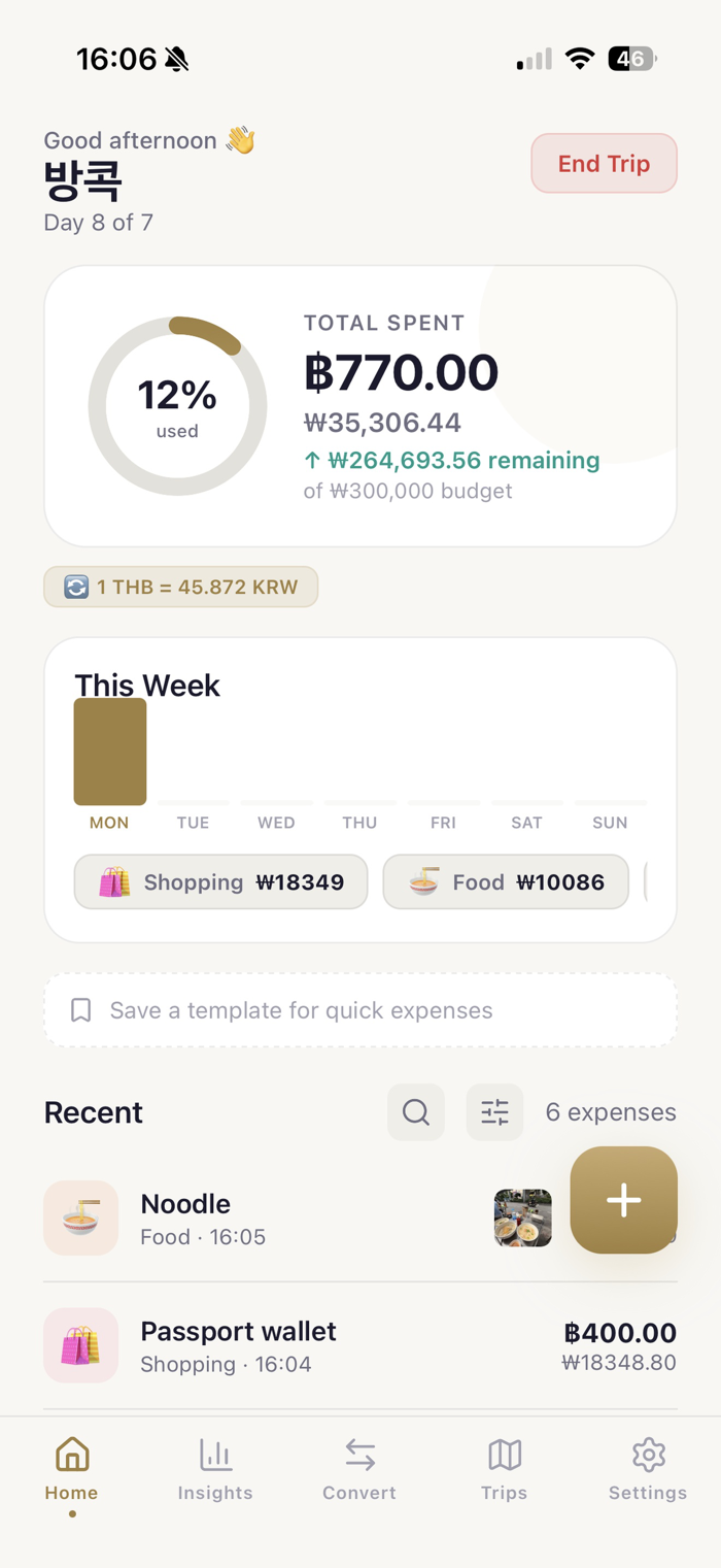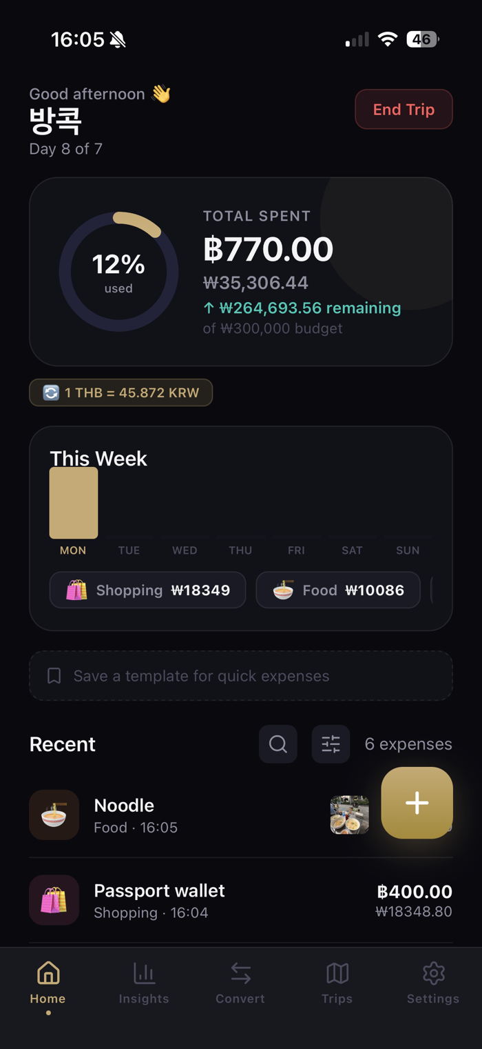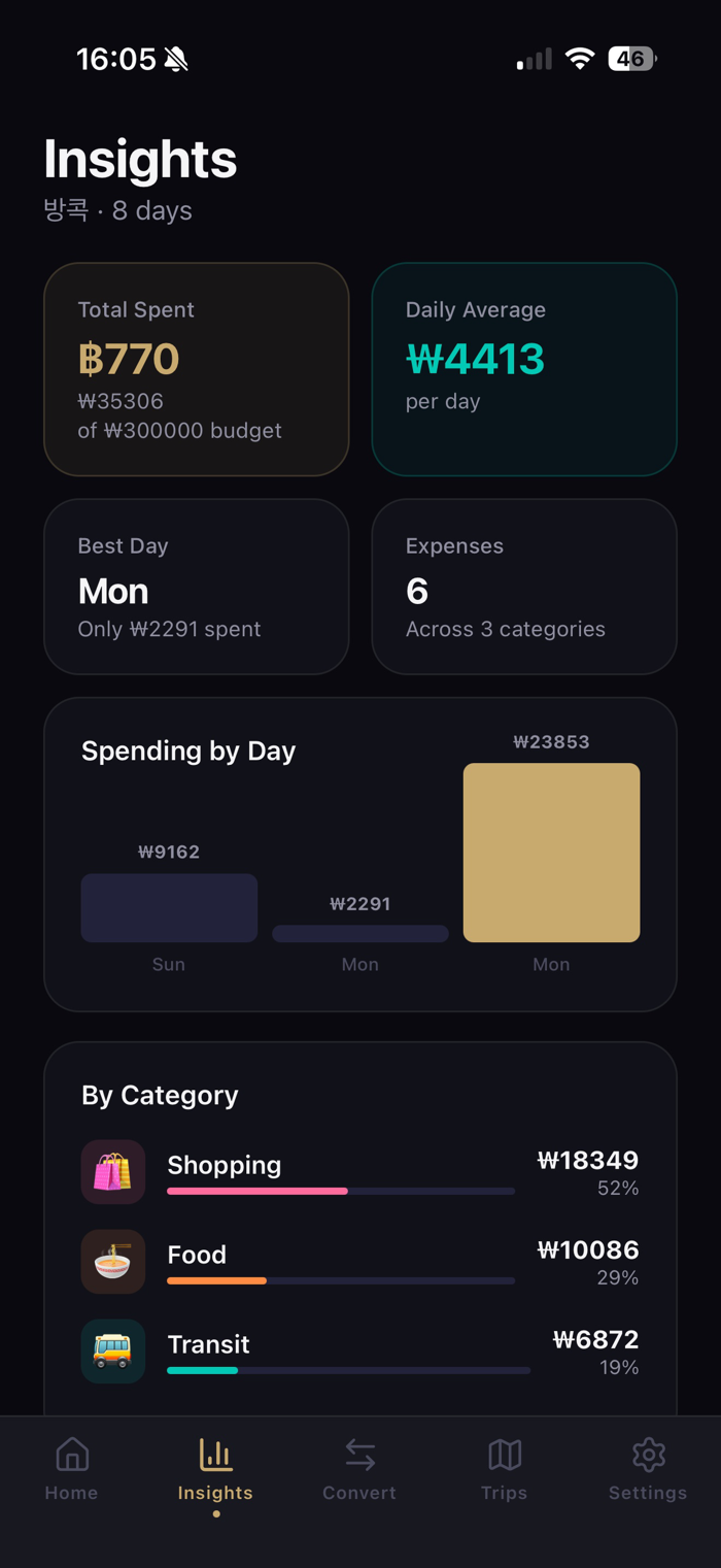 See where your money actually goes. The Insights tab breaks down your spending by category, shows your daily averages, and highlights your best and worst spending days — giving you a clear picture of your habits while you travel.