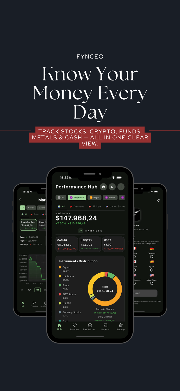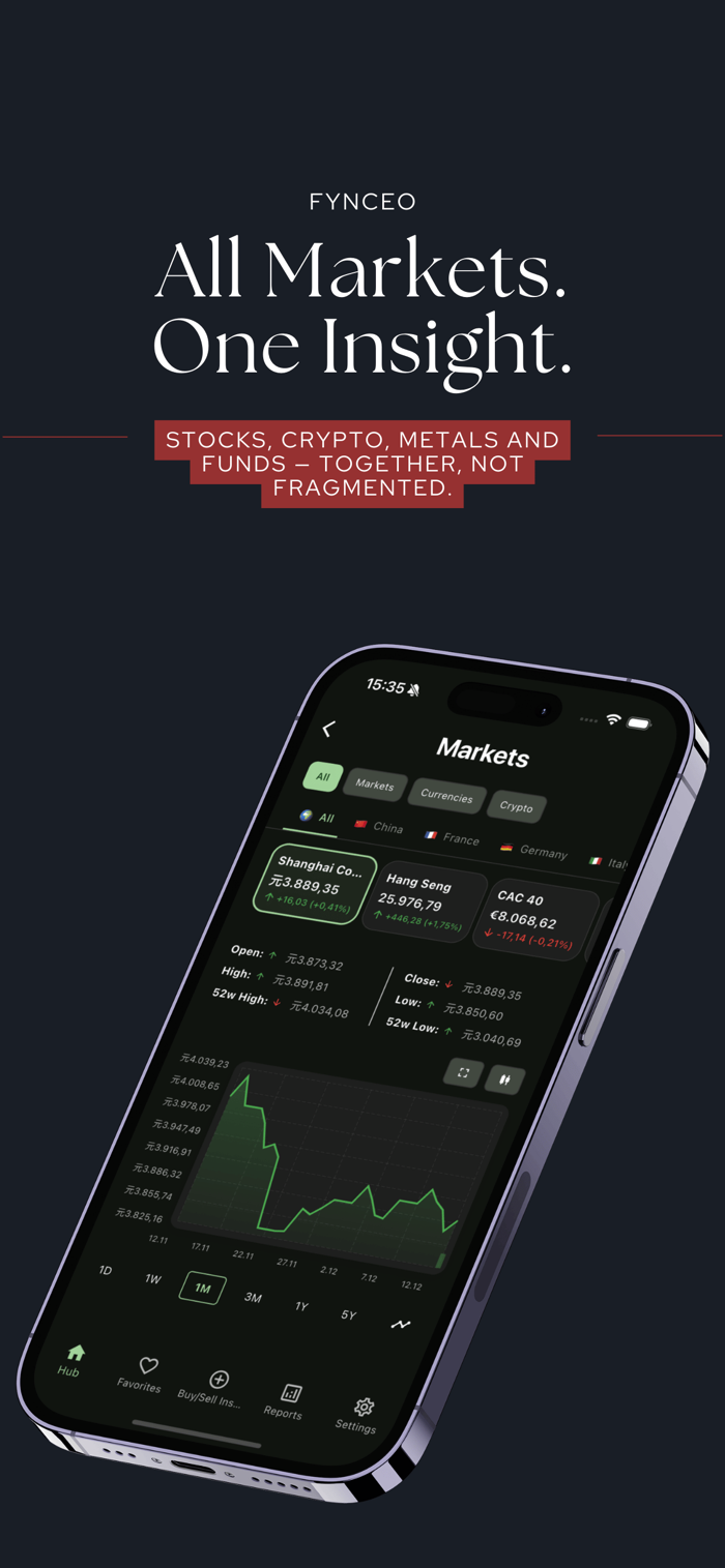 Fynceo可在一个应用中管理全部金融资产,能跟踪股票、加密货币、基金和贵金属,提供统一视图与分析以助明智决策。具备全球市场追踪、资产管理、表现分析及多货币支持等功能,免费即可开始使用,Premium解锁高级功能。服务条款:https://fynceo.app/terms_of_service.html;隐私政策:https://fynceo.app/privacy_policy.html;EULA:https://www.apple.com/legal/internet-services/itunes/dev/stdeula/
