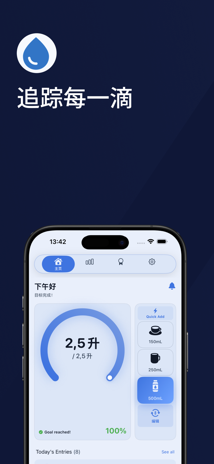 积累连续记录、达成目标,解锁成就。让喝水变得有趣又有奖励感。