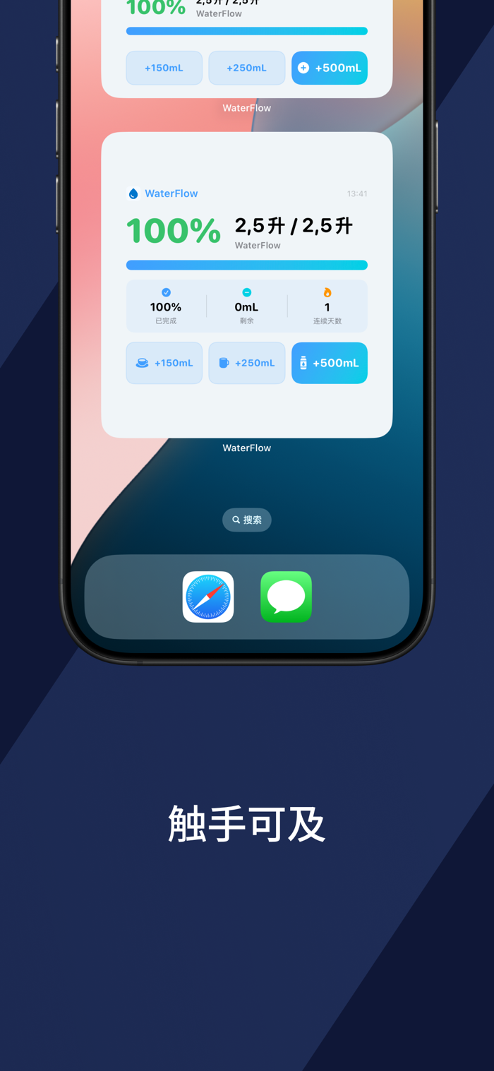 将 WaterFlow 小组件添加到主屏幕和锁定屏幕,一眼查看进度。通过灵动岛实时追踪饮水量。