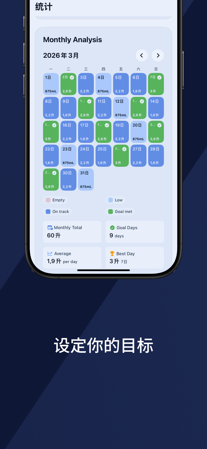 查看每日、每周和每月记录。发现规律、打破个人记录,通过精美图表了解你的补水习惯。