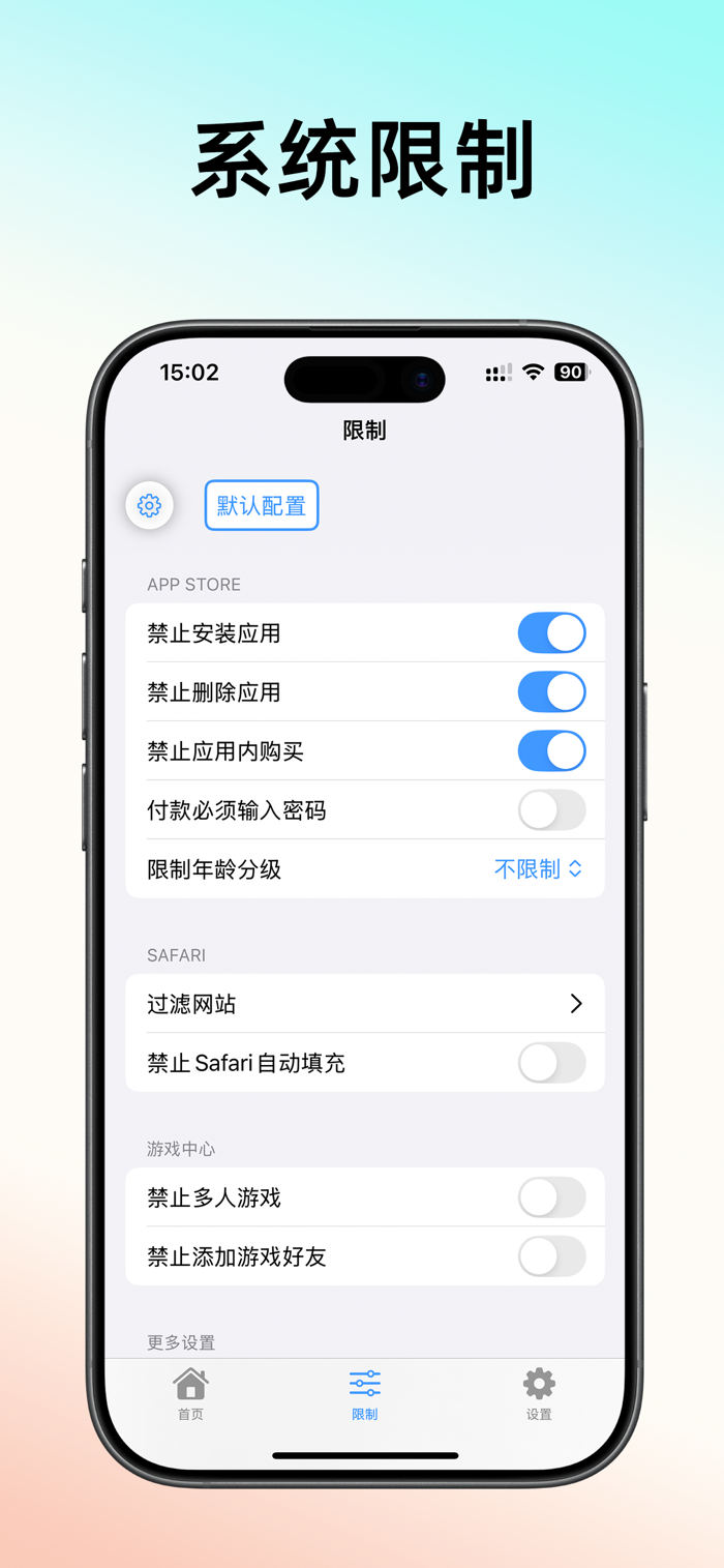 - 更多限制:禁止安装/删除应用,禁止应用内购买,支付必须使用密码,网站黑白名单过滤等。