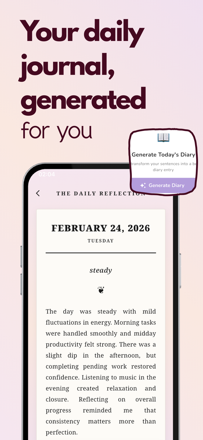 At the end of the day, AI transforms your short notes into a beautifully written journal story — automatically.