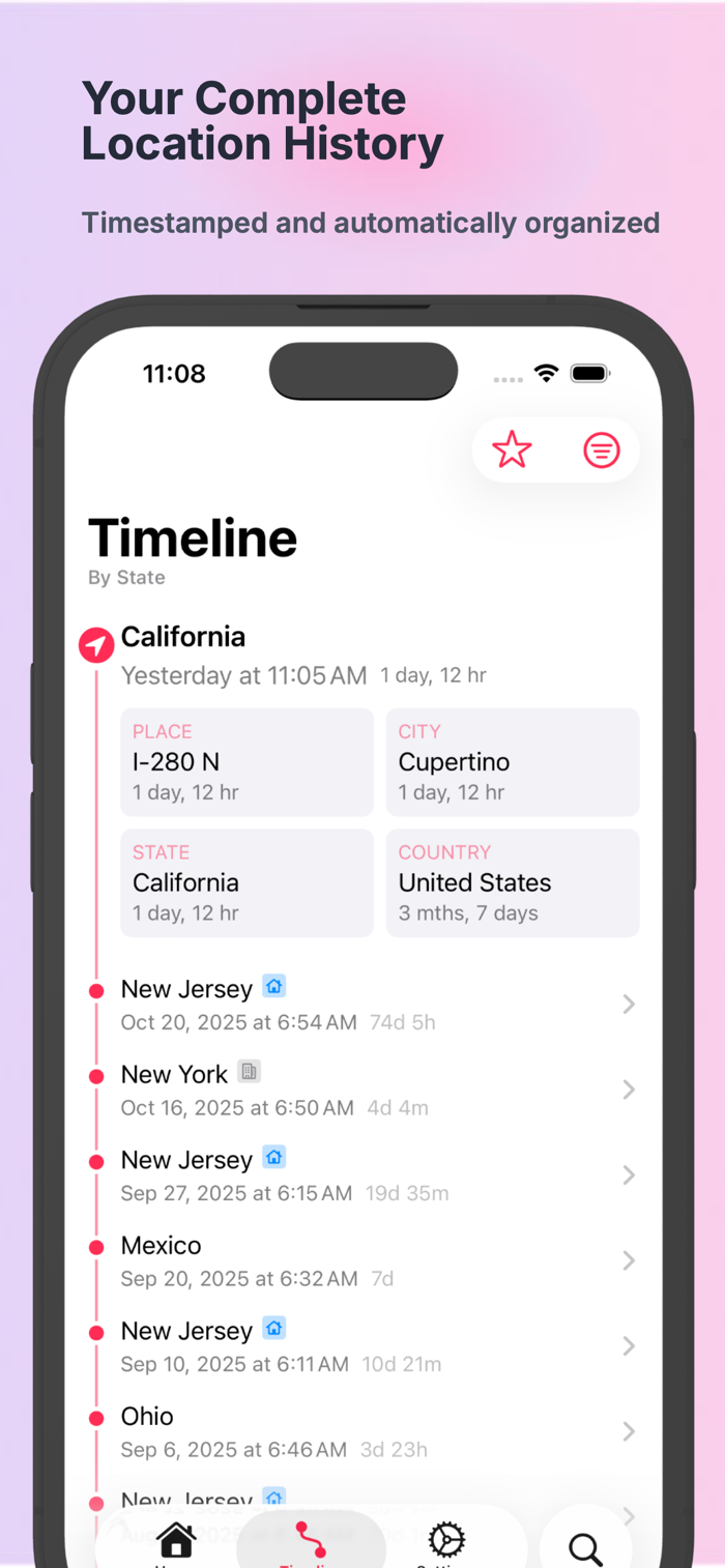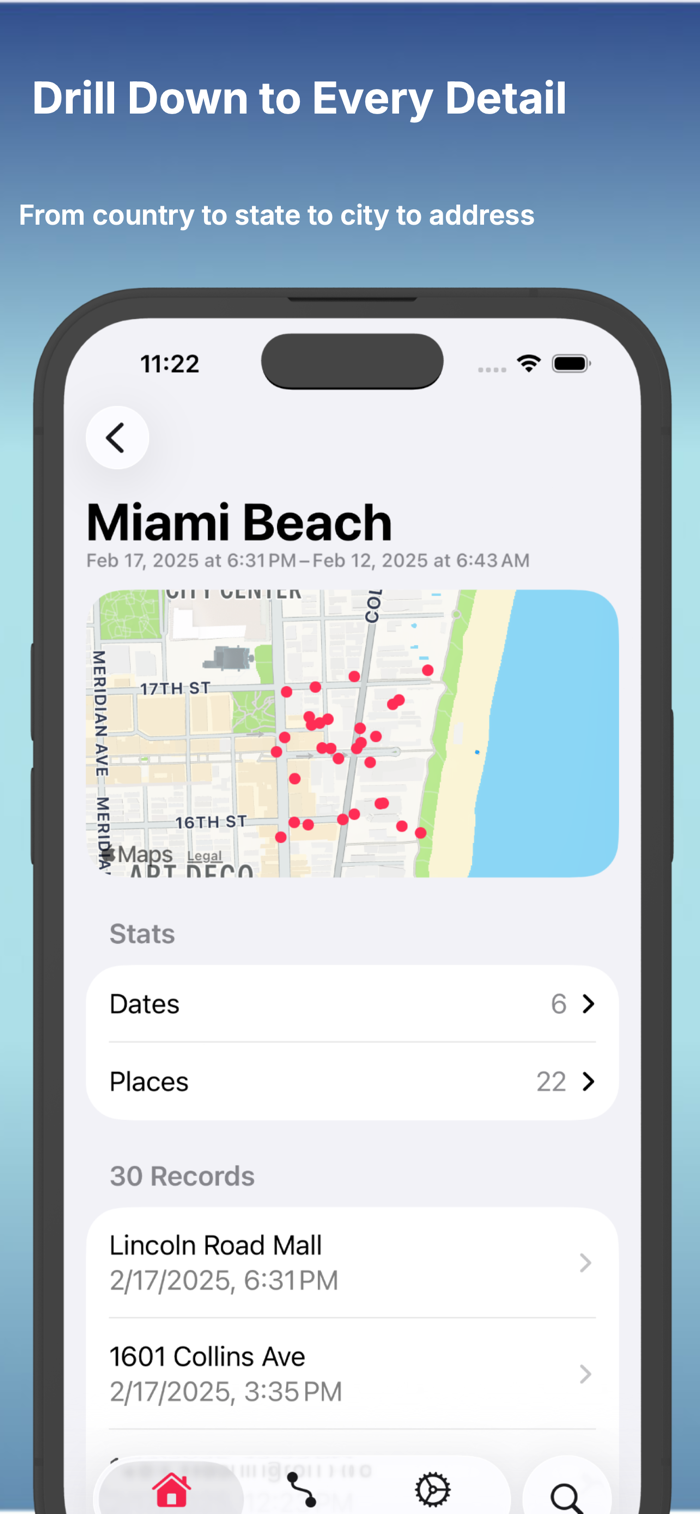 Works seamlessly across iPhone, iPad, and Mac. Your location history syncs automatically via iCloud, so you always have access to your complete record on any device.