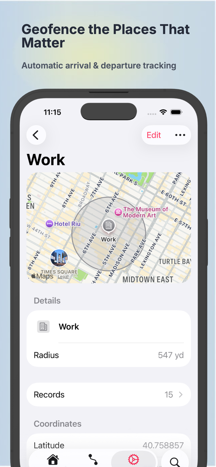 Mark important places like home, work, or anywhere you spend significant time. Location Ledger uses geofencing to automatically detect when you arrive and leave, giving you precise tracking of time spent at your most important locations.