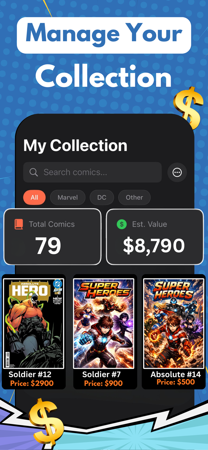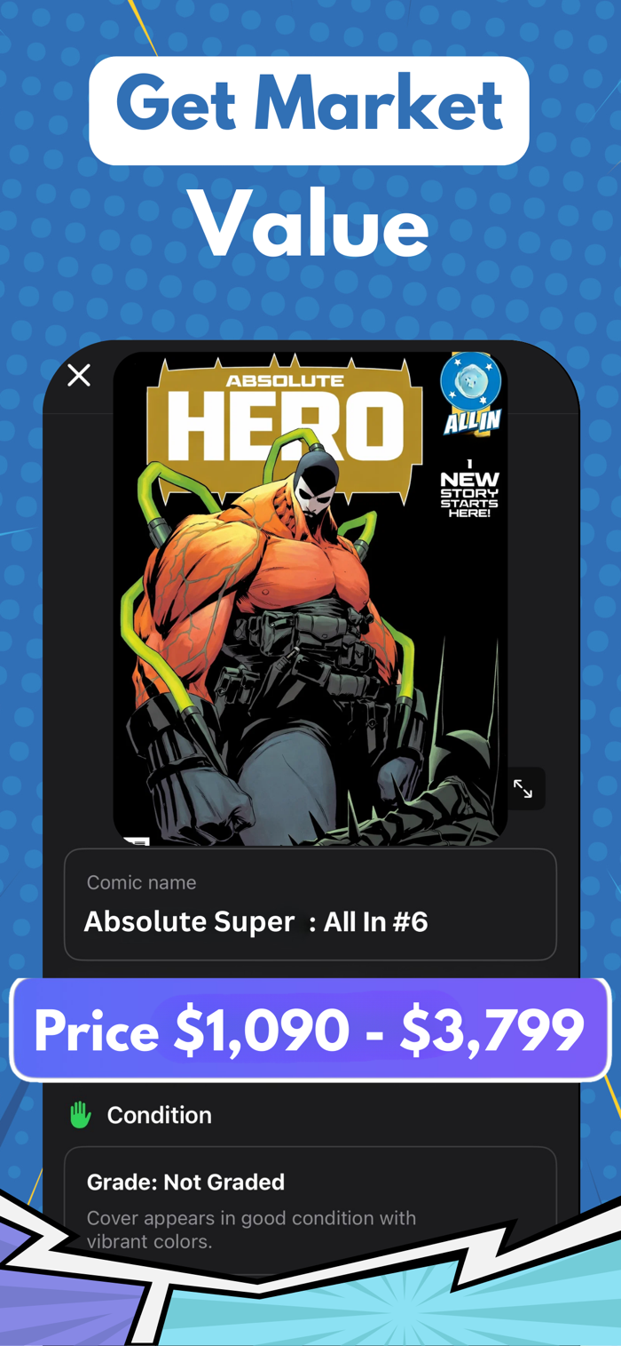 Comic Book Scanner & Appraiser利用AI技术,让手机瞬间变身专业漫画鉴定器。拍摄漫画封面照片,能秒获详细分析,包括系列名、出版商、出版年份、类型等。还可精准估算价格,进行品相评估,帮您了解漫画状态与潜在价值。能保存整理扫描的漫画,构建收藏集。提供全面详细信息,如完整书名、期号、出版商及系列信息、出版年份与产地、类型等。