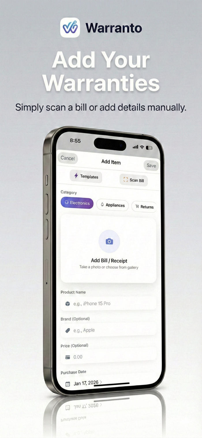 Warranto is your ultimate smart assistant for managing product warranties, receipts, and expenses. Say goodbye to cluttered drawers and faded bills—keep everything organized, secure, and accessible right from your pocket.