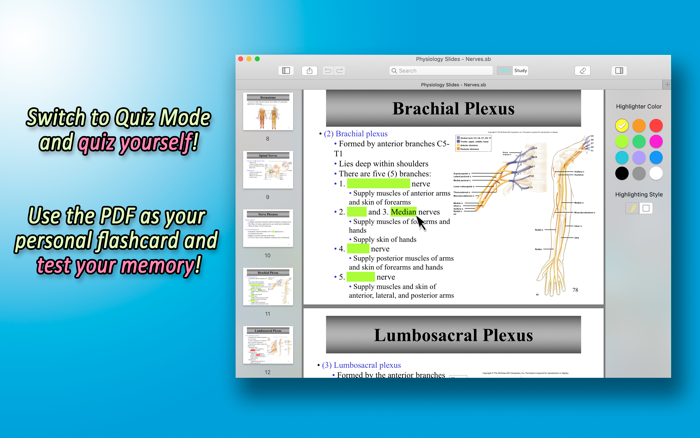 Finally an application specifically made for efficient-minded students. It’s already known that flashcards are one of the greatest ways to test your memory recall before your exam…but creating flashcards takes far too long! So here’s the trick, upload and highlight any PDF document to Study Buddy, highlight all the important terms you just KNOW you must know for that upcoming test and…that’s it! Switch to “quiz mode” in the app and all your important highlighted terms are now hidden! Test your memory recall and hover over the important terms to reveal the answer and check if you’re right! No more time wasted creating flashcards.