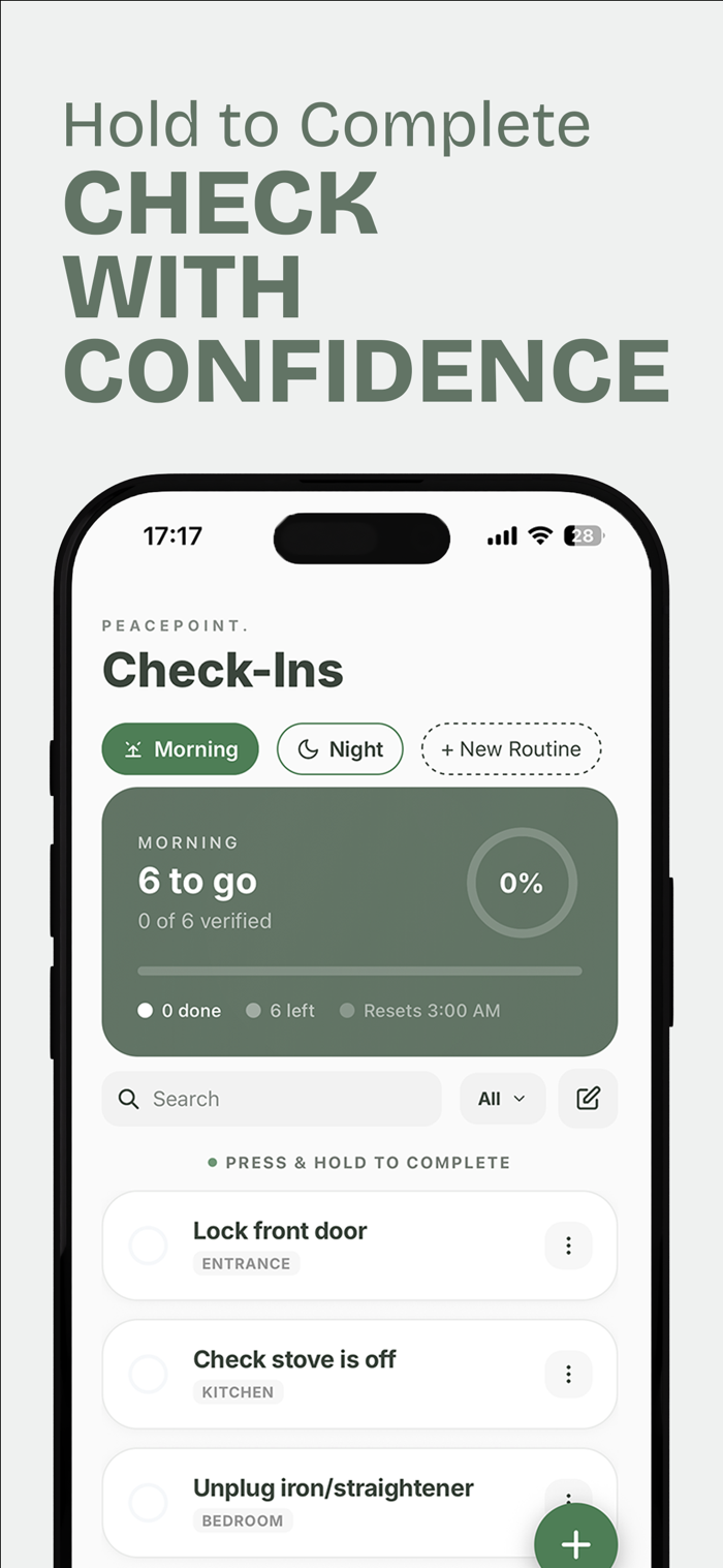 • 使用我们独特的“按住确认”交互方式管理您的安全任务(例如,早晨检查)。