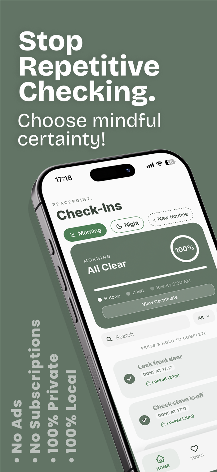 PeacePoint 是一个私人避风港,旨在帮助您打破焦虑和重复检查的循环。无论您是需要确信家里的安全,还是在恐慌时刻需要支持,PeacePoint 都能帮助您一次检查到位,之后倍感自信。