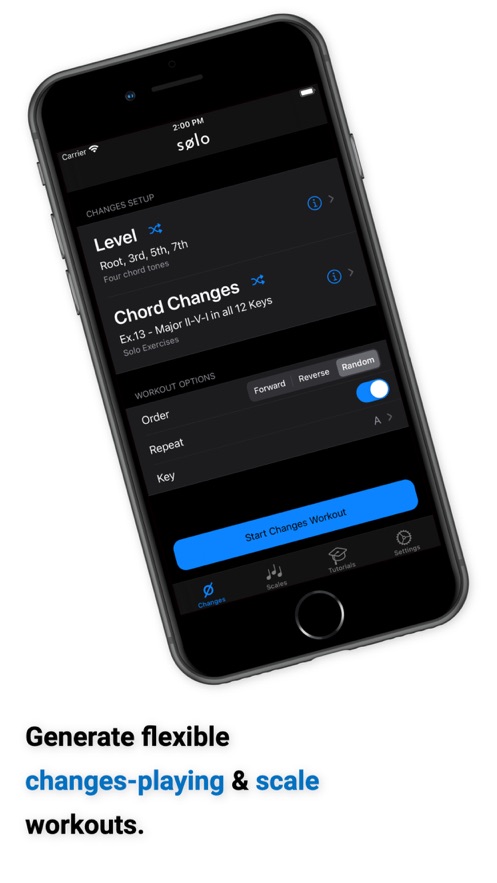 ‣ Using common progressions, Solo presents you with one chord symbol or scale at a time and asks you to find and play a series of notes based on their intervallic function.