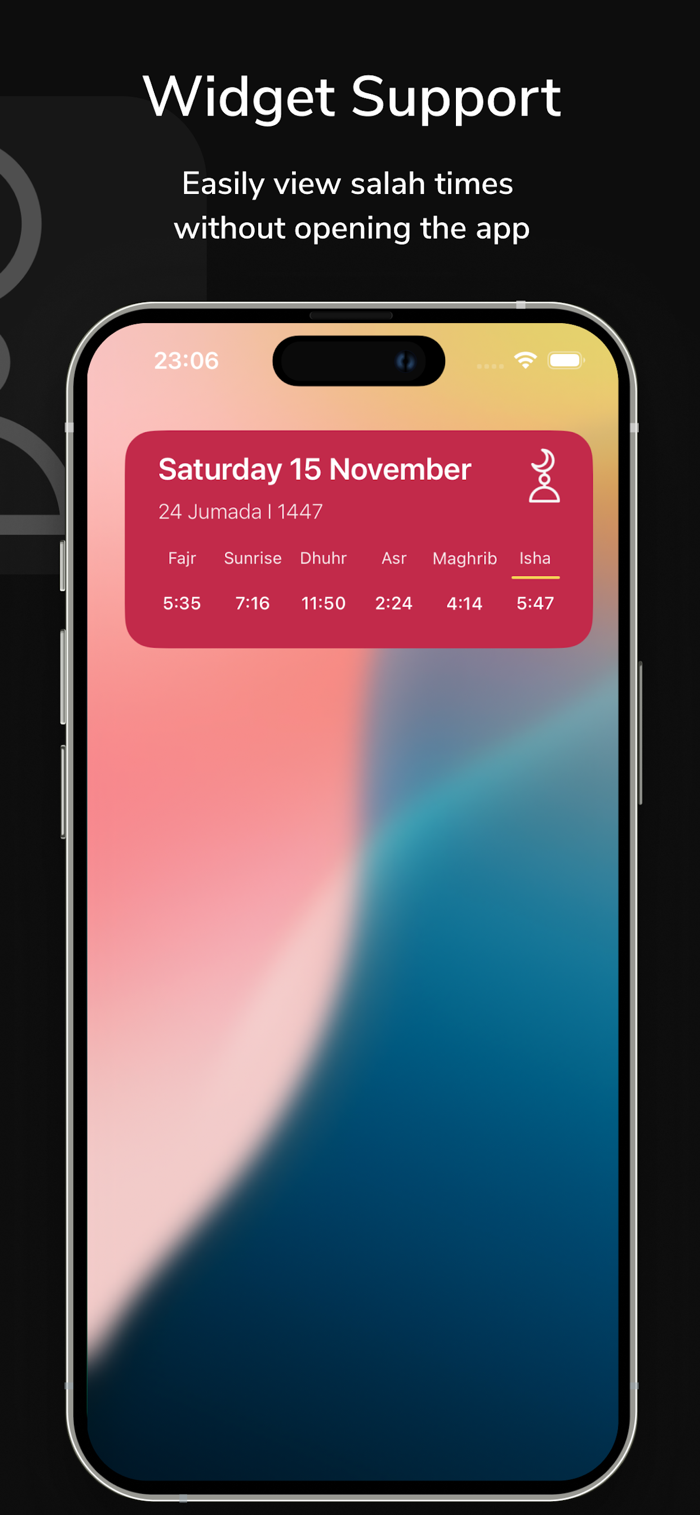Check prayer times instantly without opening the app. Our widget displays all five daily prayers right on your home screen.