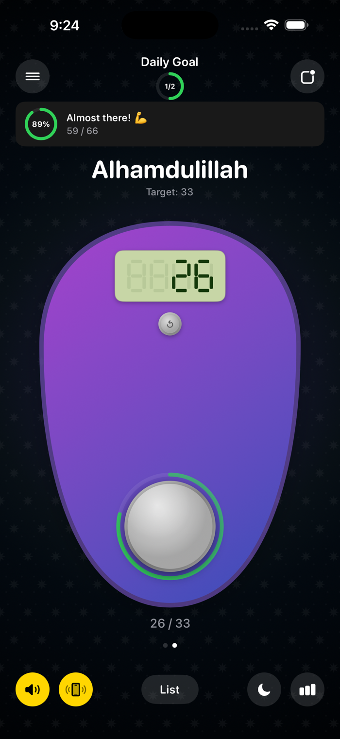 Phased Counting: Perfect for 33/33/33 Tasbih Fatimah, with "Swipe to Next" functionality.