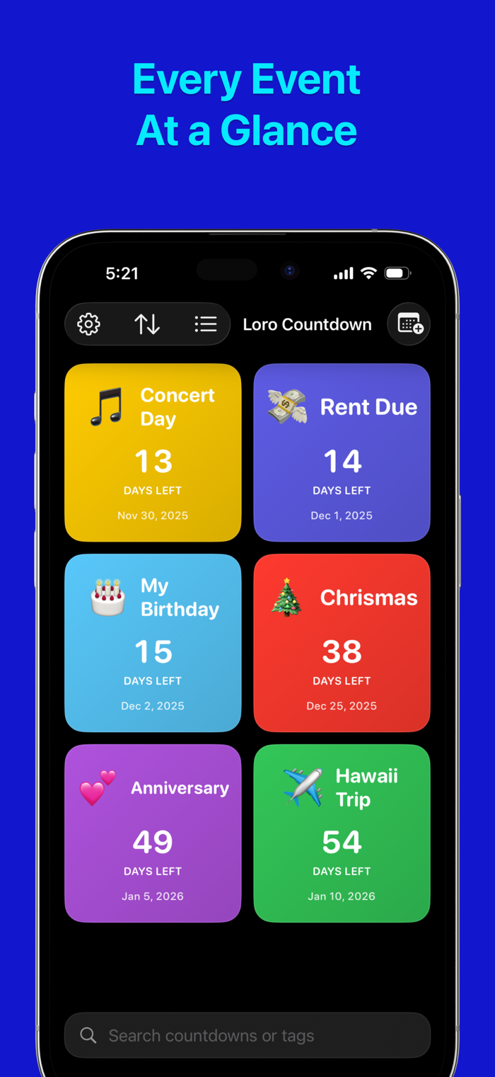 Loro Countdown helps you keep birthdays, trips, bills, exams, anniversaries, and all other important dates organized in one clean, simple place. Just set a date and the app shows exactly how much time is left.