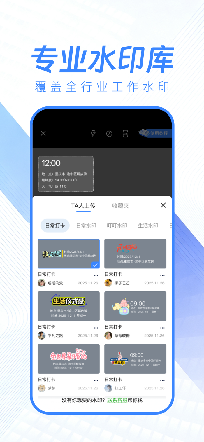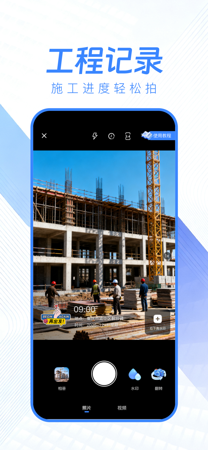 这款专业易用的打卡水印相机,拍照可自动添加含日期、地点等信息的水印,满足工作记录需求。有海量水印模板,全场景覆盖,支持图片修复。操作界面简洁,支持连续拍照,快速批量打卡。添加水印时能保留照片高清画质,还适用于项目巡检、考勤签到、旅行打卡等多种工作与生活场景,是工作考勤、外勤管理等的得力助手。