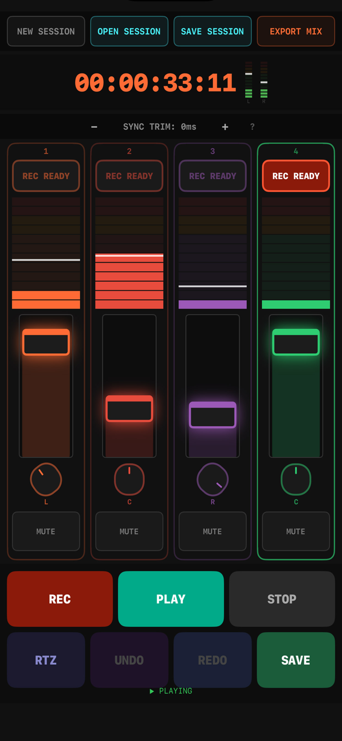 Each track has its own volume fader, pan knob, mute, and live VU meter. Record a base track, then overdub additional parts while listening to what you've already captured through your speaker or headphones. Tracks play back together in sync automatically.