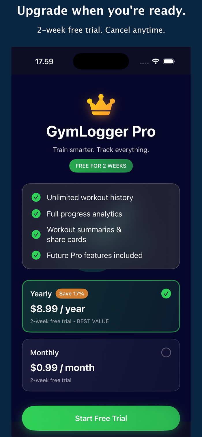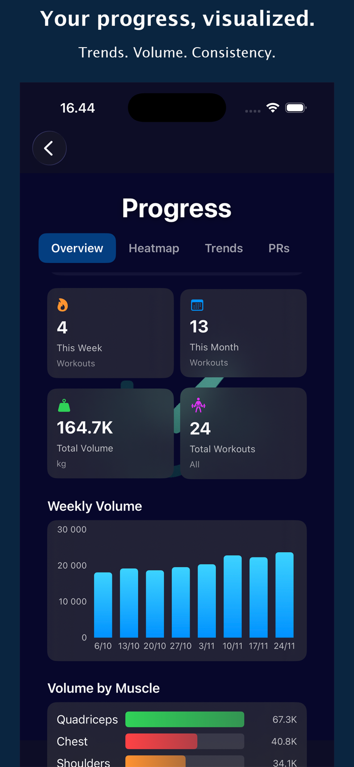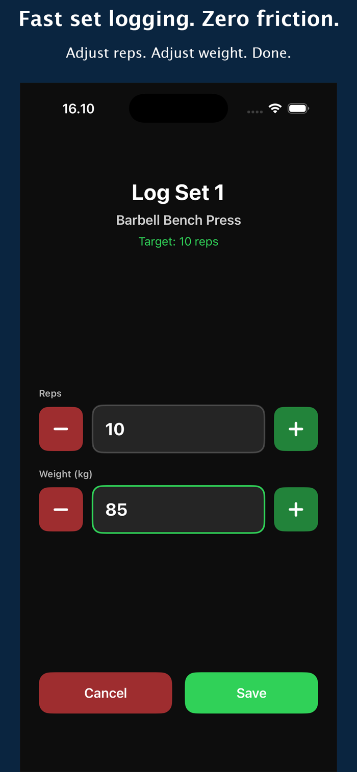 GymLogger X 专为重视结构、清晰和更聪明训练决策的力量训练者打造,没有噪音。