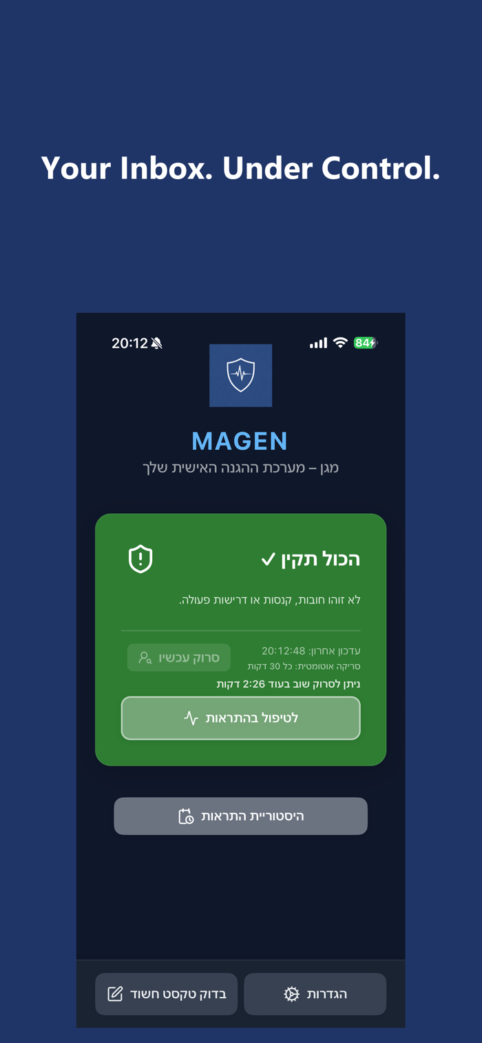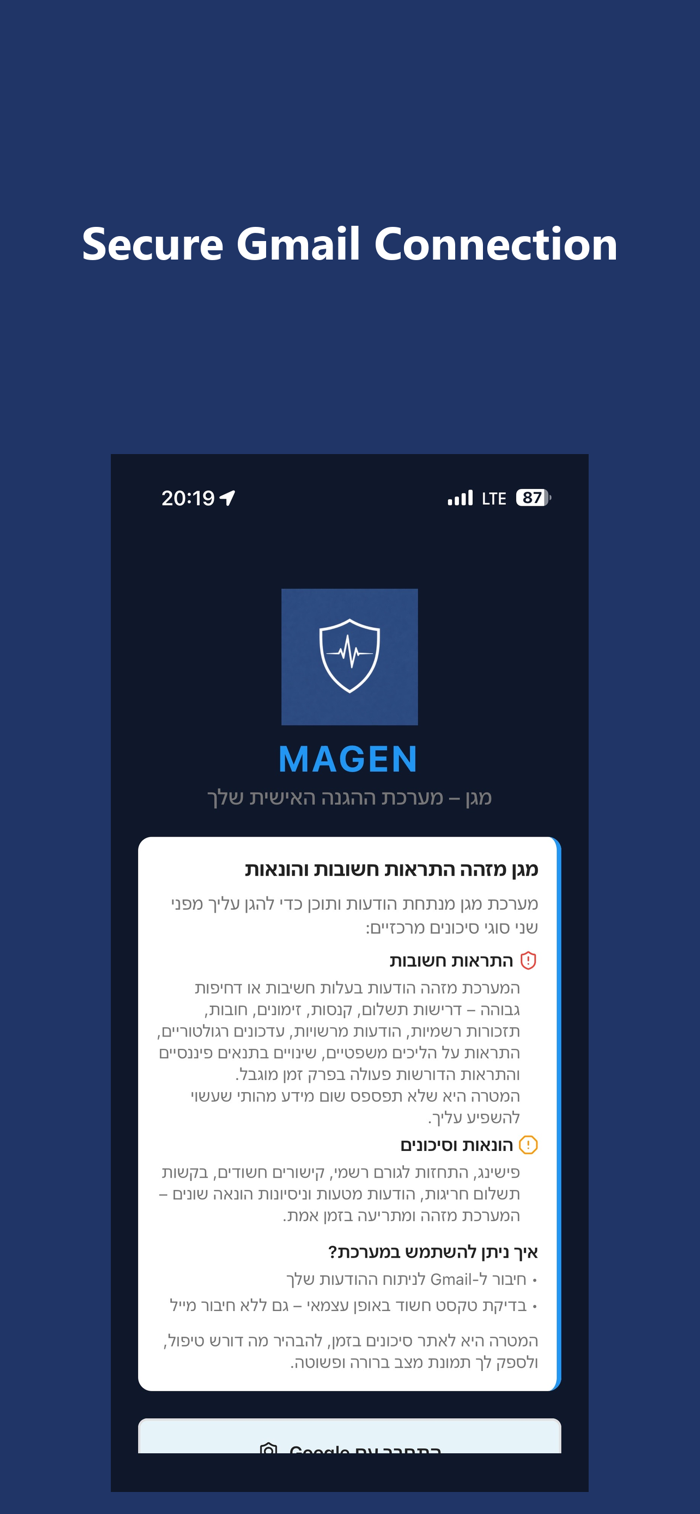 Magen是个人电子邮件保护系统,连接Gmail账户,实时检测可疑信息、网络钓鱼企图及重要提醒。具备安全Gmail连接、实时可疑活动检测、关键消息智能重要性评分、即时扫描文本或消息、清晰风险解释与安全指标、提醒历史跟踪等功能,不售卖数据,信息仅用于应用功能和保护洞察,助您清晰自信掌控收件箱,相关条款政策可查看https://magenapp.site/en/terms 及https://magenapp.site/en/privacy 。