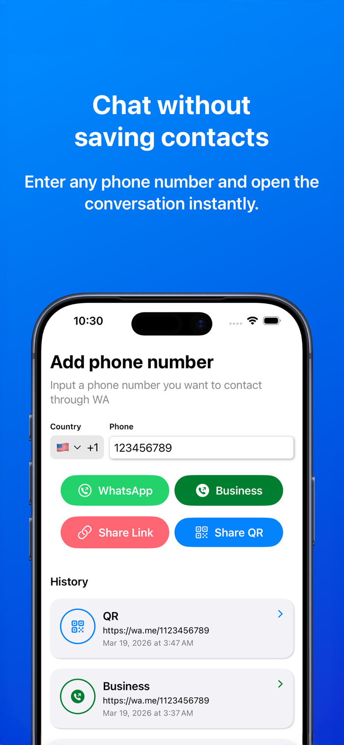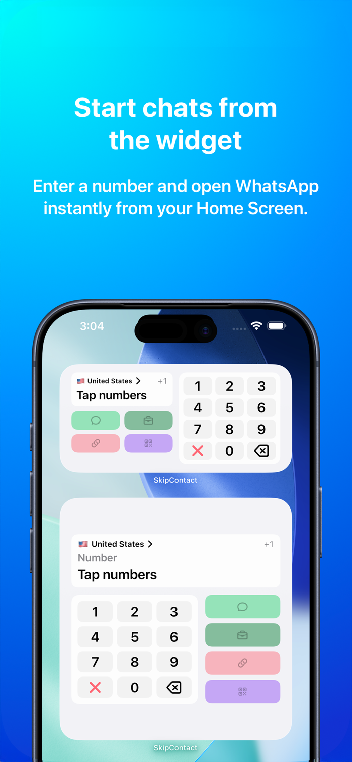 SkipContact allows you to enter a phone number and open the conversation directly in WhatsApp or WhatsApp Business.
