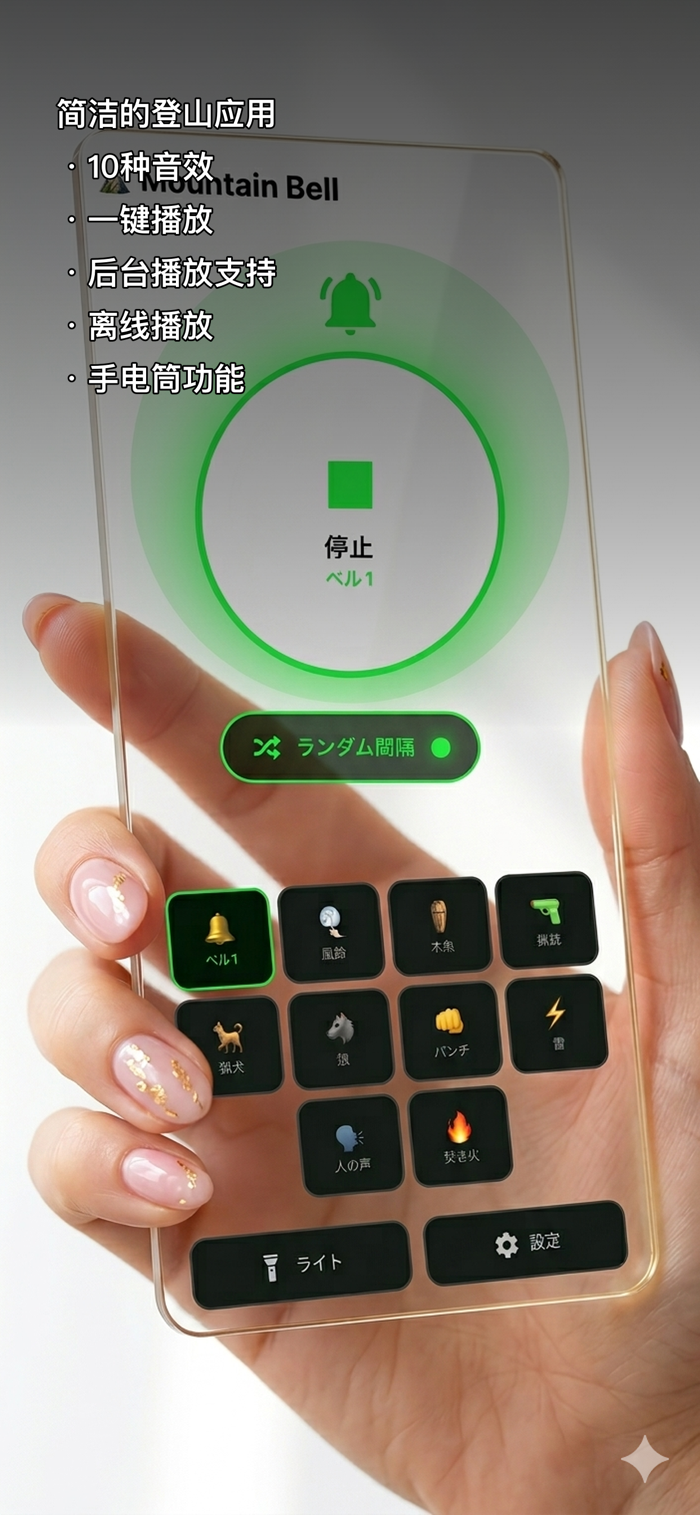 登山铃是一款专为徒步旅行者、露营者和户外运动爱好者设计的防熊安全音效应用。播放多种声音,提醒野生动物您的存在,确保旅途安全。功能特点:10种音效:铃铛、猎犬吠叫、人声对话、篝火声等随机间隔播放,模拟自然声音完全离线运行,无需信号省电暗色界面支持后台音频播放