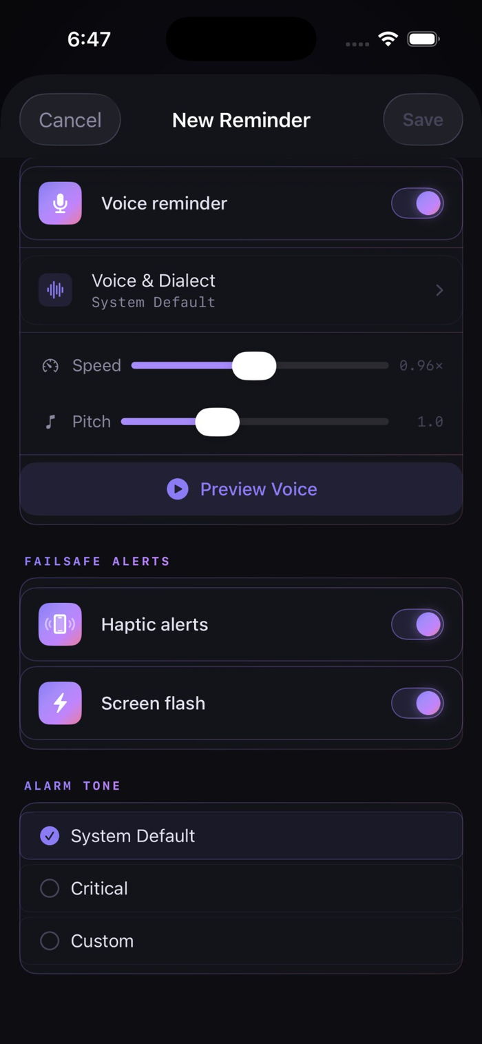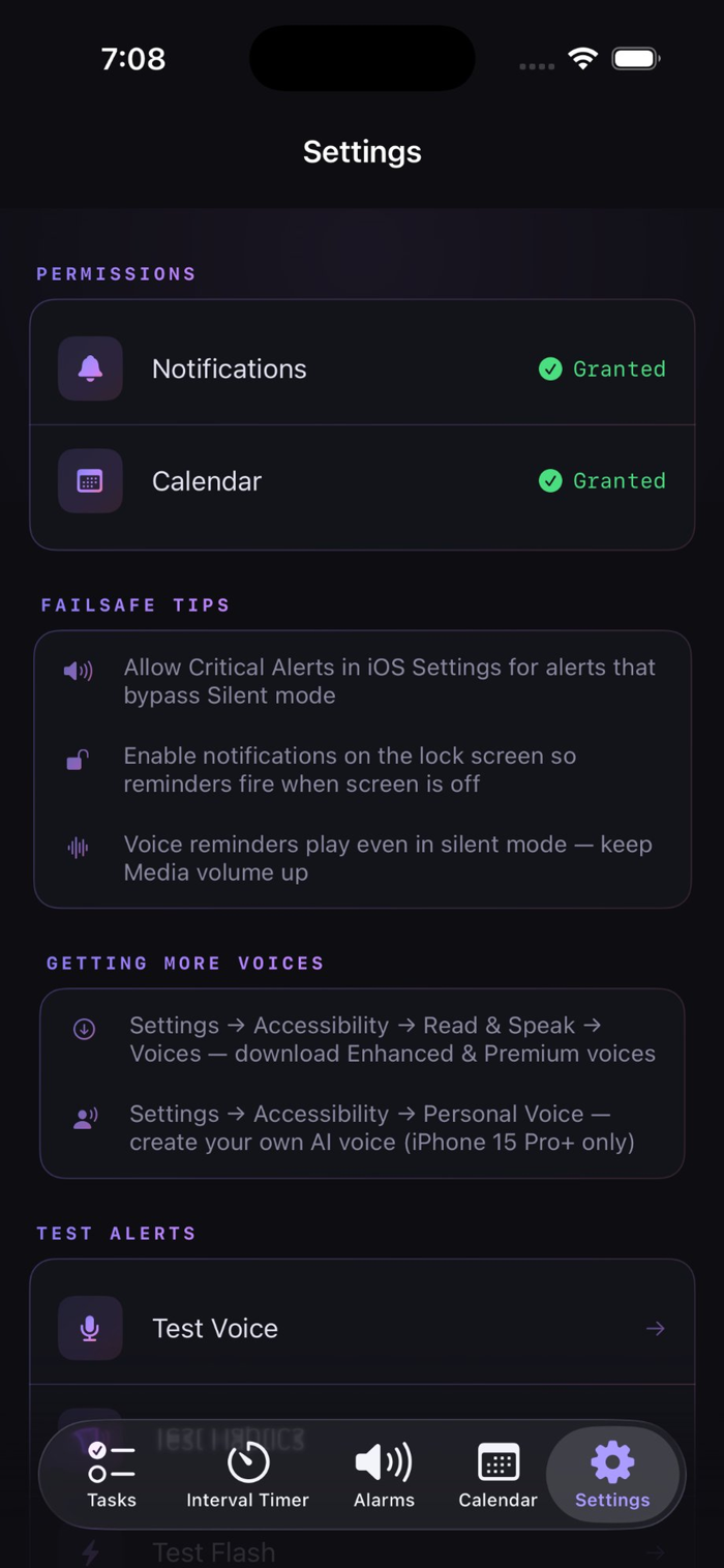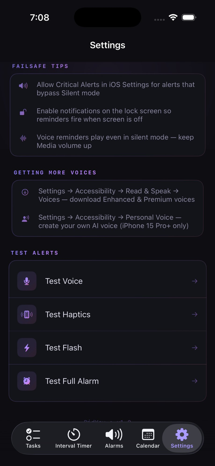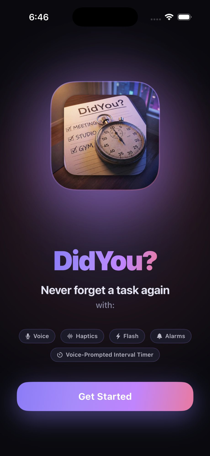 DidYou?是一款可靠的提醒应用程序,专为真正需要记住事情的人打造,如运动员、忙碌的专业人士、护理人员等。与多数提醒应用不同,它在闹钟响起时,会同时语音播报、闪屏、持续震动并播放自定义音频,直至用户按下停止按钮。其语音提示间隔定时器能大声指导,设置工作和休息时长及循环次数后,会从3倒数到1提醒开始,每秒倒计时,让用户无需看屏幕。还有语音提醒、持续触觉反馈、闪屏提醒等可靠功能。