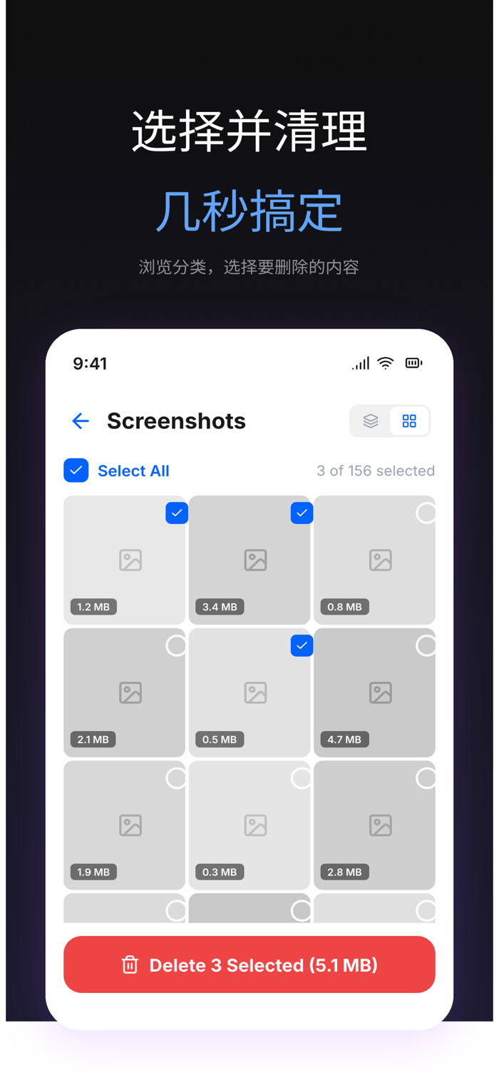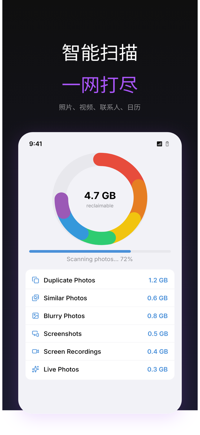 iPhone存储空间已满。照片无法保存。应用频繁崩溃。Storage Cleaner能找到并删除所有占用空间的内容——仅需30秒。