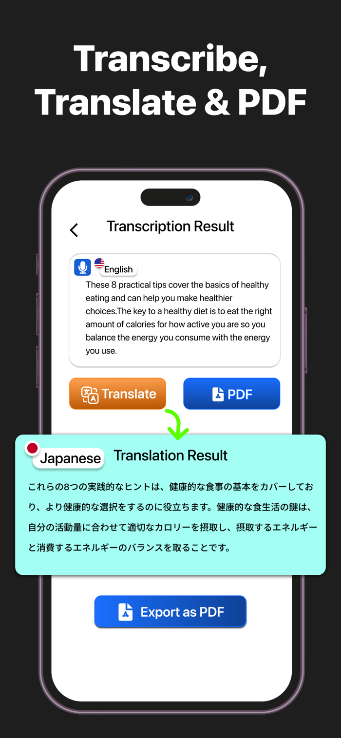 PDF Export – Convert transcripts into professional PDFs for sharing, printing, or record-keeping. Keep your notes organized anywhere.