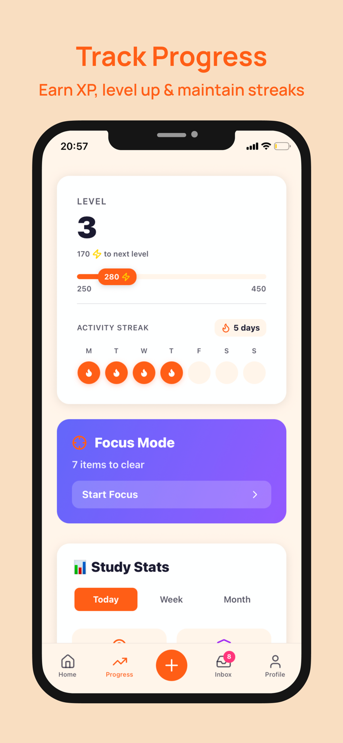 Instead of jumping between notes, decks, and screens, you study by scrolling through a dedicated learning feed. Each scroll presents a single, focused question or flashcard, helping you stay in rhythm and avoid cognitive overload. This format makes studying feel lighter and more natural, allowing you to fit meaningful practice into short moments throughout your day while maintaining deep focus.