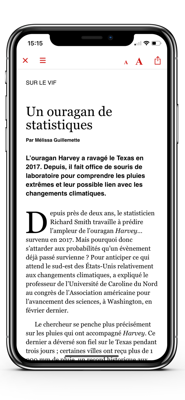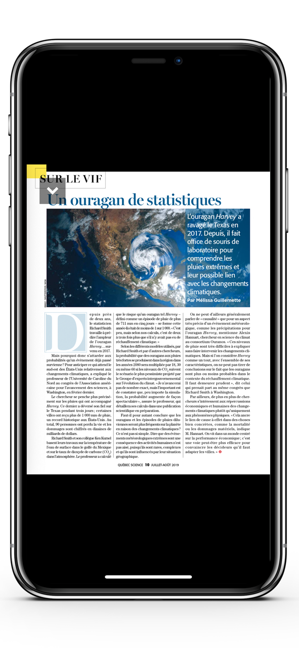 在iPhone和iPad上可发现魁北克科学的数字版,支持舒适的横屏或竖屏阅读模式。魁北克科学是科研与大众的重要纽带,探讨科学技术相关问题并以科学视角关注重大时事新闻,由Vélo Québec Éditions出版,每年发行八期。订阅数字版时,若订阅纸质和数字版或仅数字版,用邮箱作标识符,密码与Vélo Québec网站相同,数字版单期购买5.49加元,网址:https://www.velo.qc.ca/Modalites-utilisation 。