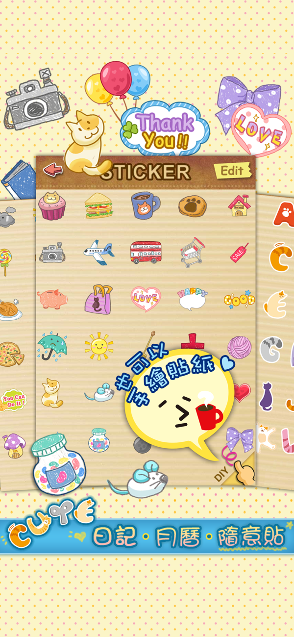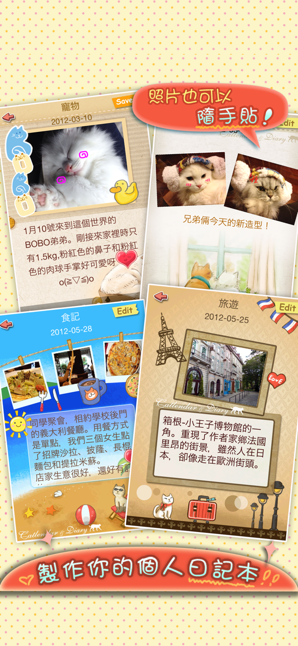 CATlendar是一款专属于爱猫一族的可爱手帐,兼具行程记事与日记功能。它与iCalendar同步,安装后无需重新输入事件数据。其特色包括精心设计的猫咪万年历,内建多种代办事件类别及定期/重复提醒功能;提供百款逗趣贴纸、喵字母贴纸、可自制手绘贴纸和照片随手贴;支持建立多种专属日记本,日记可直接分享至FB,还支持iPhone 5/6显示及重要节庆与农历显示。