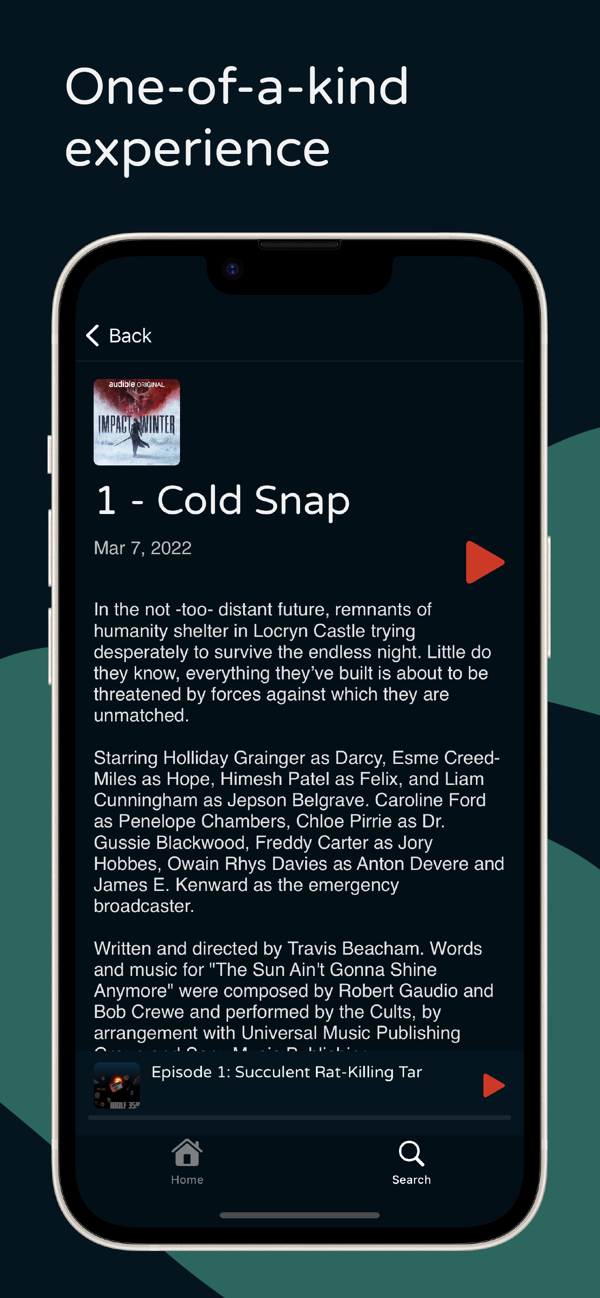 Heerie is the home of Audio Shows. Audio shows, also known as audio dramas or fiction podcasts, are like a combination of audiobooks and tv shows, but in an audio-only format. Imagine being transported into a fully-realized fictional world, complete with a cast of talented voice actors bringing the characters to life and immersive sound design that makes you feel like part of the action.