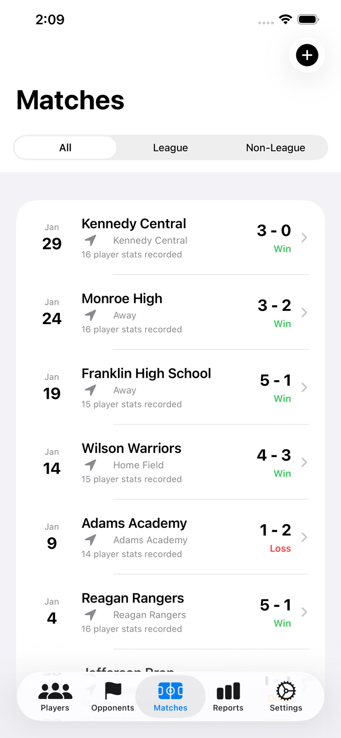 Go into Touchline Mode and track stats in real time as they happen on the pitch. Large buttons for easy tracking as plays unfold. Running clock for each player while they're actively in the match. Substitution queue to easily swap players in and out. Log custom game events — water breaks, referee discussions, camera reviews — all timestamped to the match clock. Add match notes on the fly so nothing is forgotten after the final whistle. All stats flow directly into your match history.