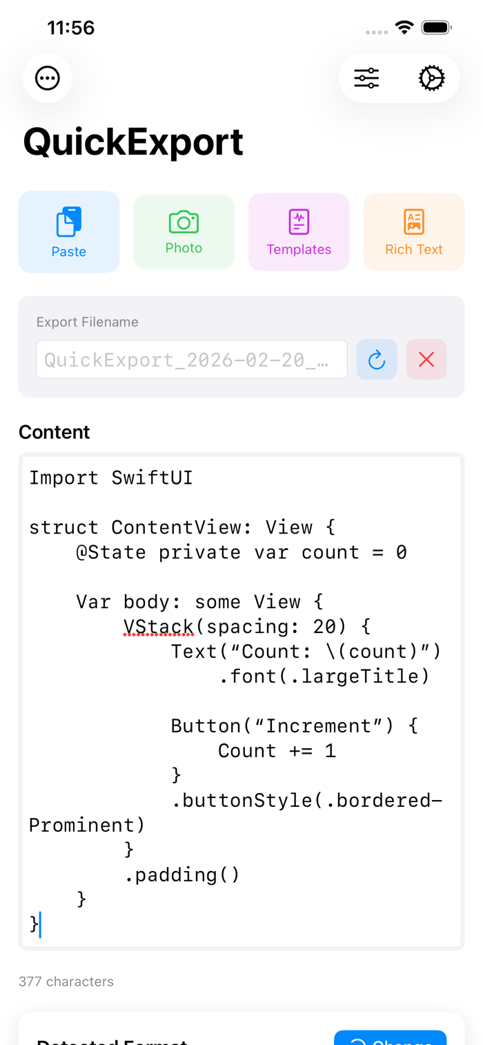 QuickExport is the fastest way to turn text and images into beautifully formatted documents right on your iPhone. Whether you're coding, writing, or working on the go, QuickExport detects your content type and exports it perfectly.