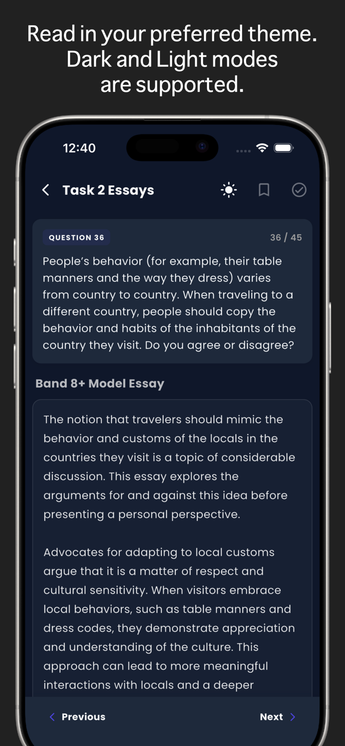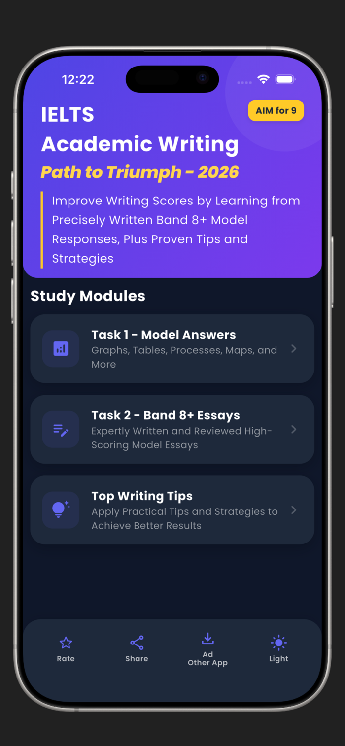 IELTS Writing Triumph - 2026是一款为雅思学术考生打造的综合学习应用。它提供结构化指导、高质量范文及实用策略,助考生自信应对写作任务1和任务2。亮点包括:有大量精心编写的范文,展示强词汇运用、清晰结构和有效任务回应;全面覆盖任务1和任务2的各类题型;提供可直接用于写作练习的实用写作技巧和策略,助力提升写作清晰度、连贯性和任务完成度,以获更高分数。