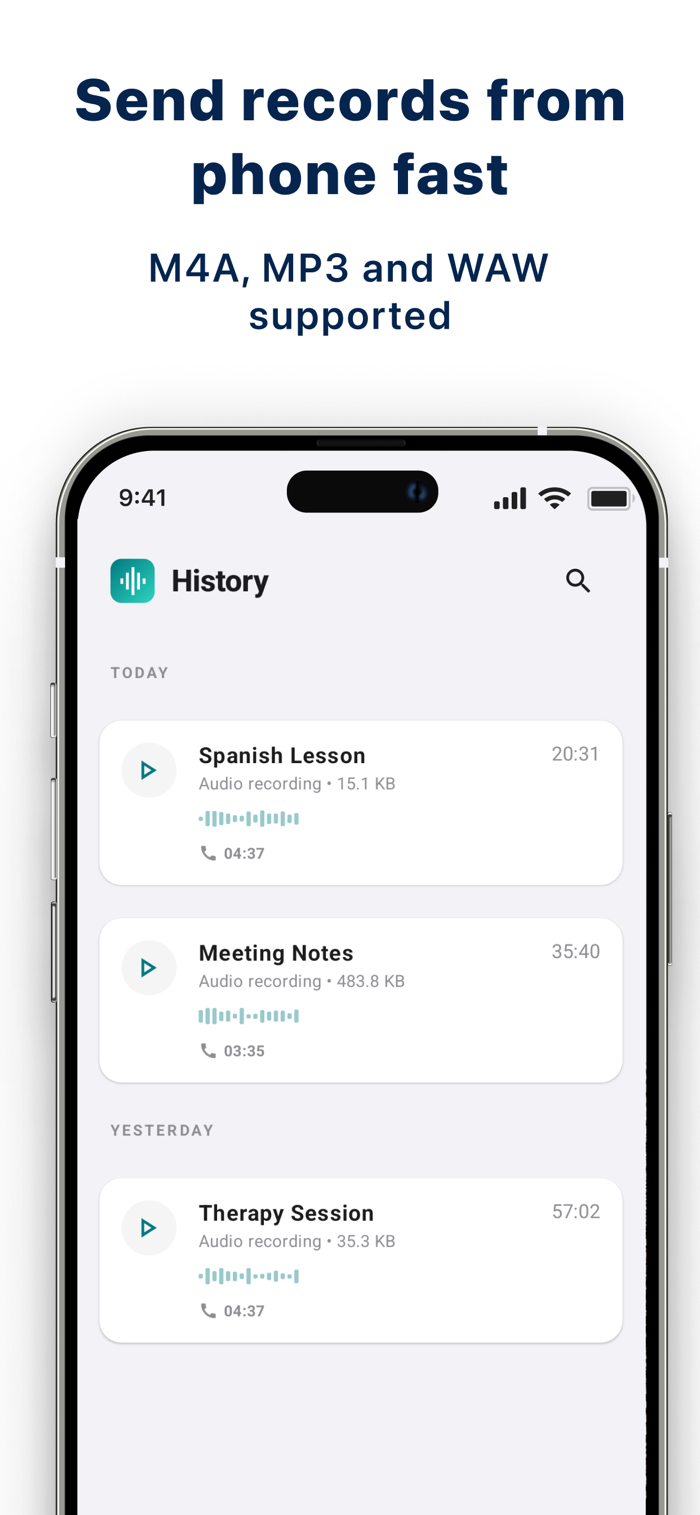 Recording History & Search — View all your recordings sorted by date; search and find them quickly. Duration, file size, and transcription text — all in one place.