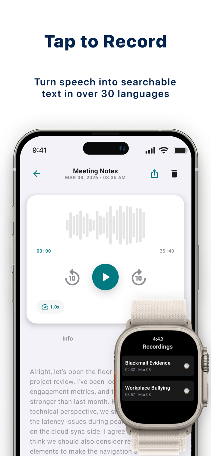 One-Tap Recording — Open the app, press the big record button, that's it. No complicated menus, just recording. From Apple Watch or iPhone — same one tap.