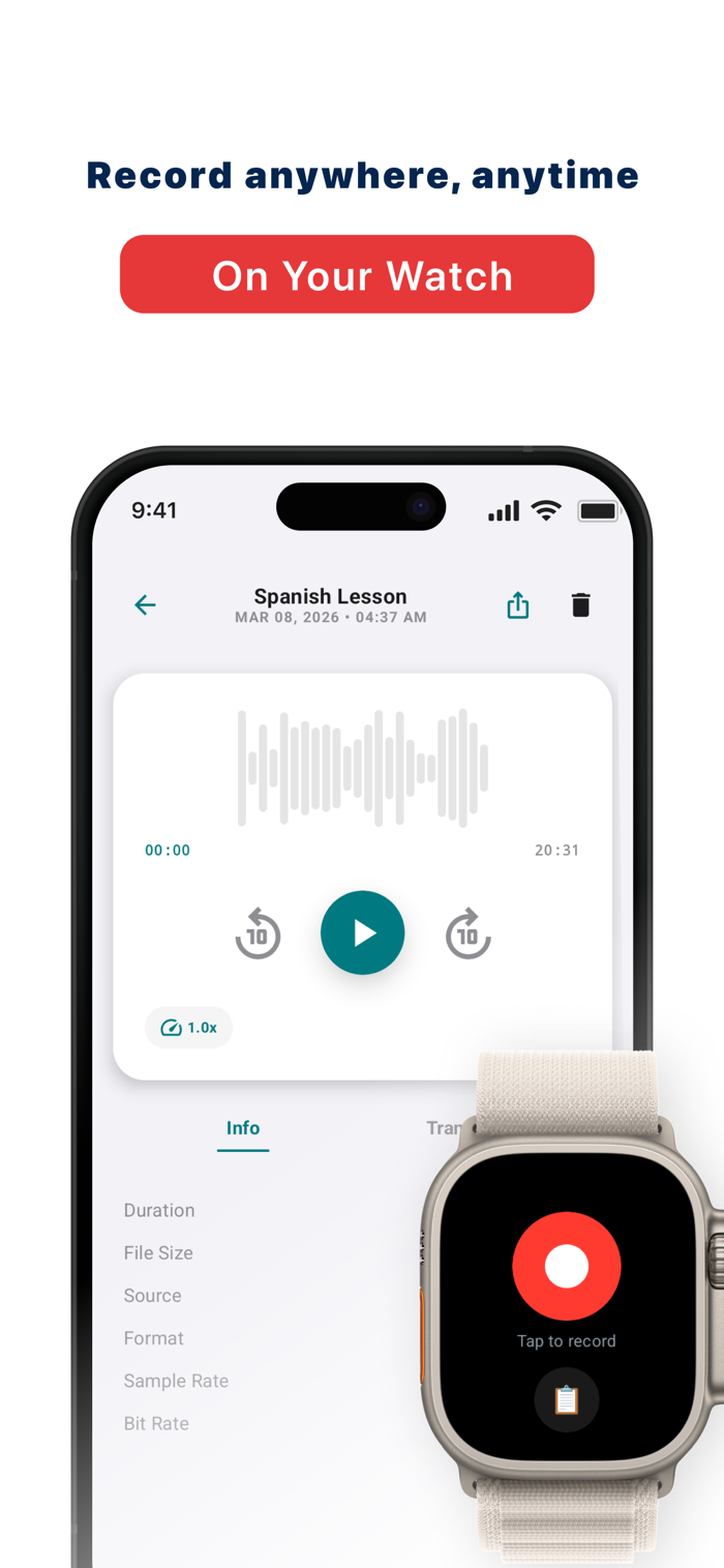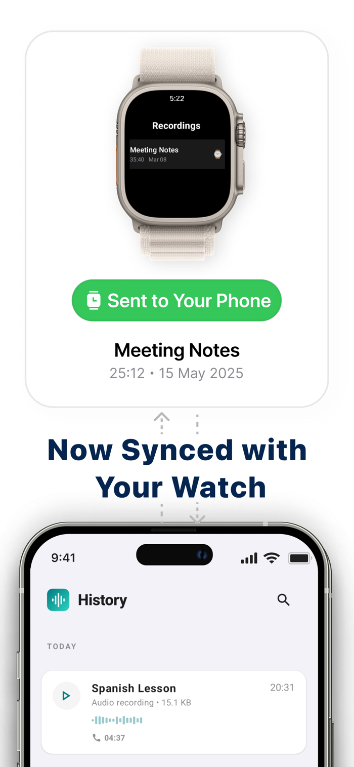 • Record on your watch — Apple Watch voice recording from your wrist. One tap on your watch or phone; recordings sync to your iPhone.