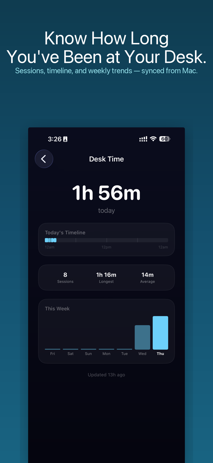 No accounts. No sign-ups. No cloud sync. No analytics sent anywhere. Everything — your password, your desk time data, your proximity detection — stays between your Mac and your iPhone over a direct Bluetooth connection. Period.