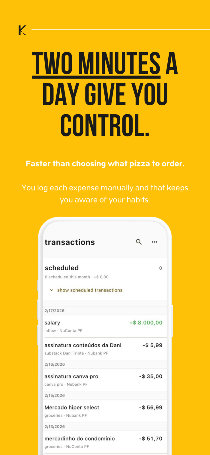 You don't need to log every coffee. A quick check-in keeps your picture accurate — whether you check in daily or weekly, kvit stays trustworthy. The projection only works if the data is real, and the check-in makes that easy.