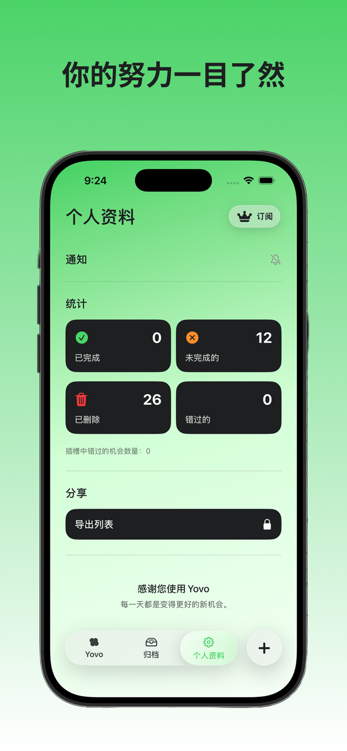 Yovo是一款生产力应用,通过简短临时的每日清单帮你保持专注,一次完成一项任务。其主要功能包括每日任务清单、临时任务、循序渐进、进度追踪与归档、小组件、极限模式、简洁极简界面。适合想清晰工作、养成好习惯、稳步前进的人,无压力无干扰。应用可能有订阅或内购解锁更多功能,付款通过Apple ID扣除,订阅自动续订可管理或取消,有隐私政策和使用条款。