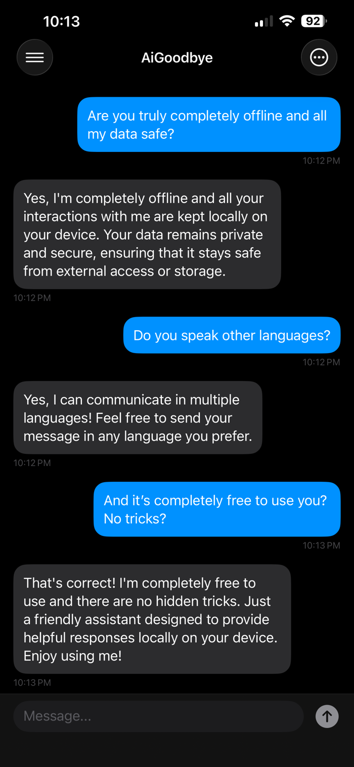 Unlike cloud-based AI assistants, AiGoodbye processes everything locally on your device. Your conversations, questions, and data never leave your phone. No servers. No tracking. No data collection.